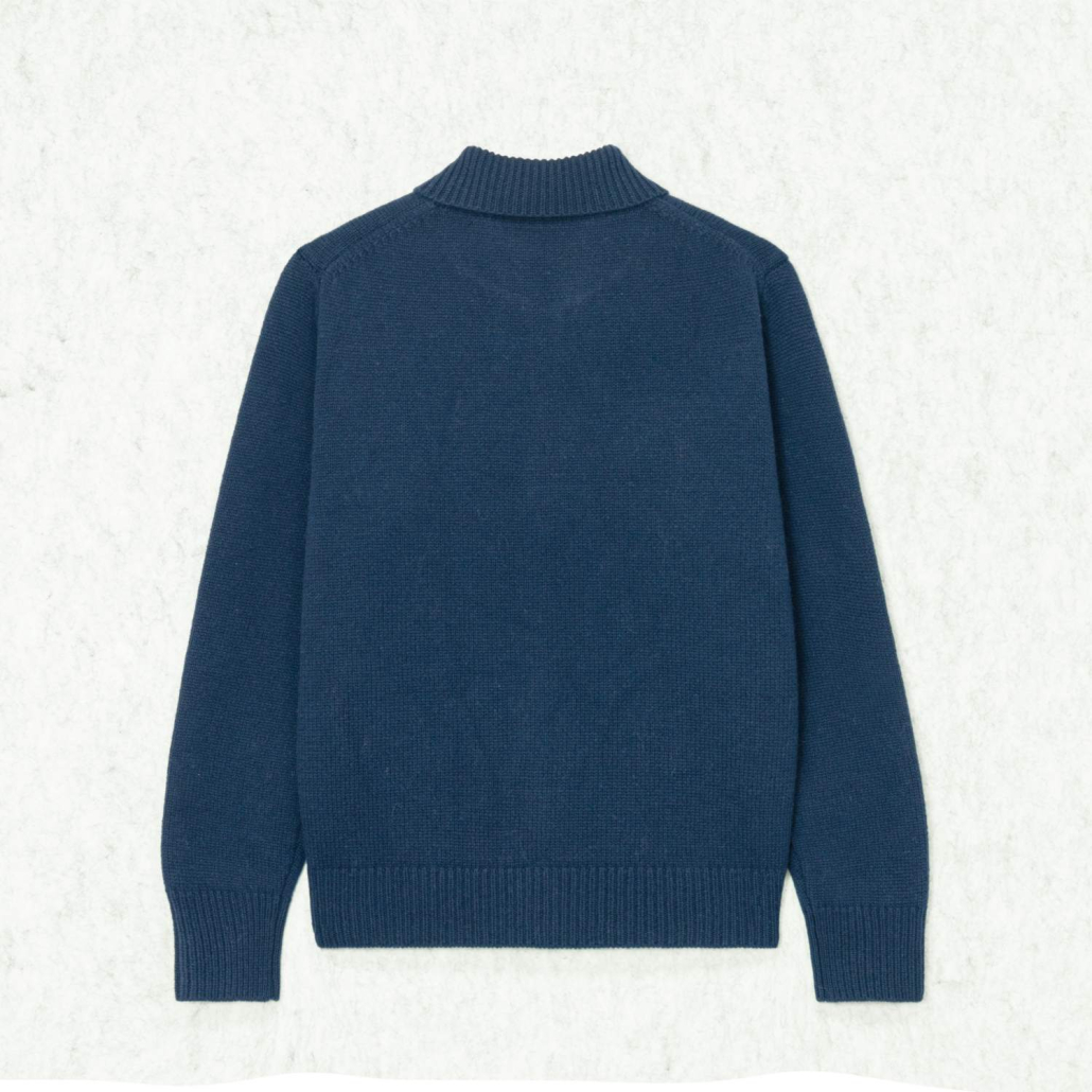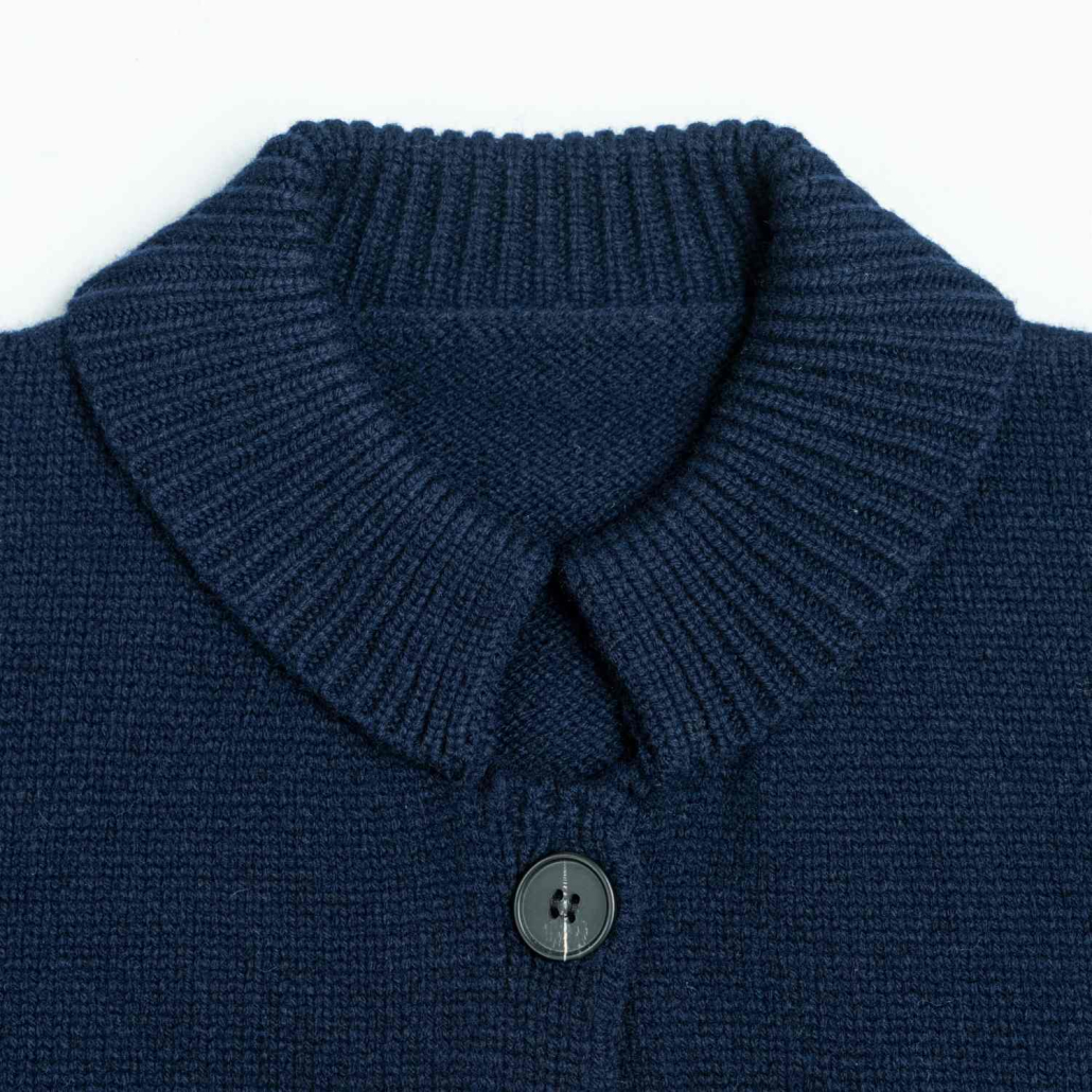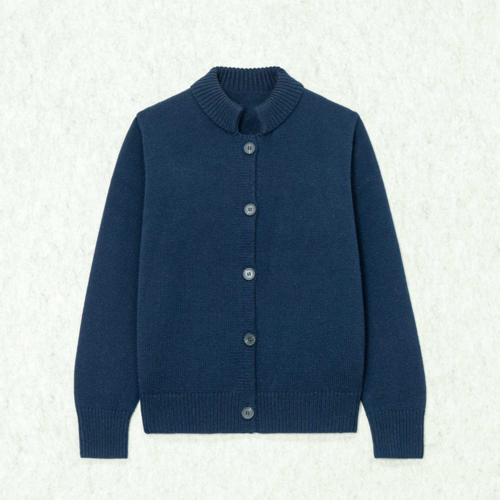 A timeless wool knit cardigan in a deep navy blue, featuring a sophisticated ribbed mock neck. This long-sleeve piece offers a clean, minimalist button-down design for versatile everyday layering.