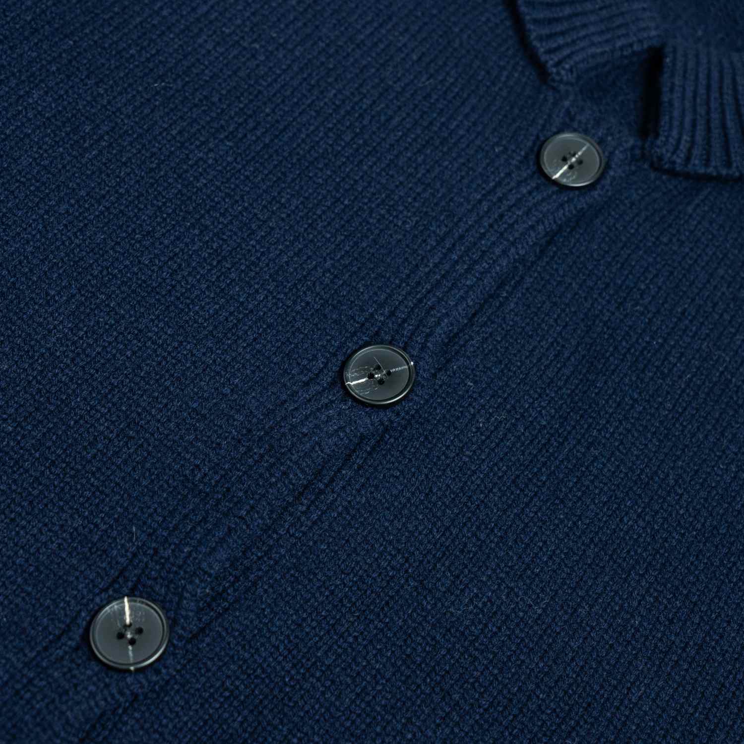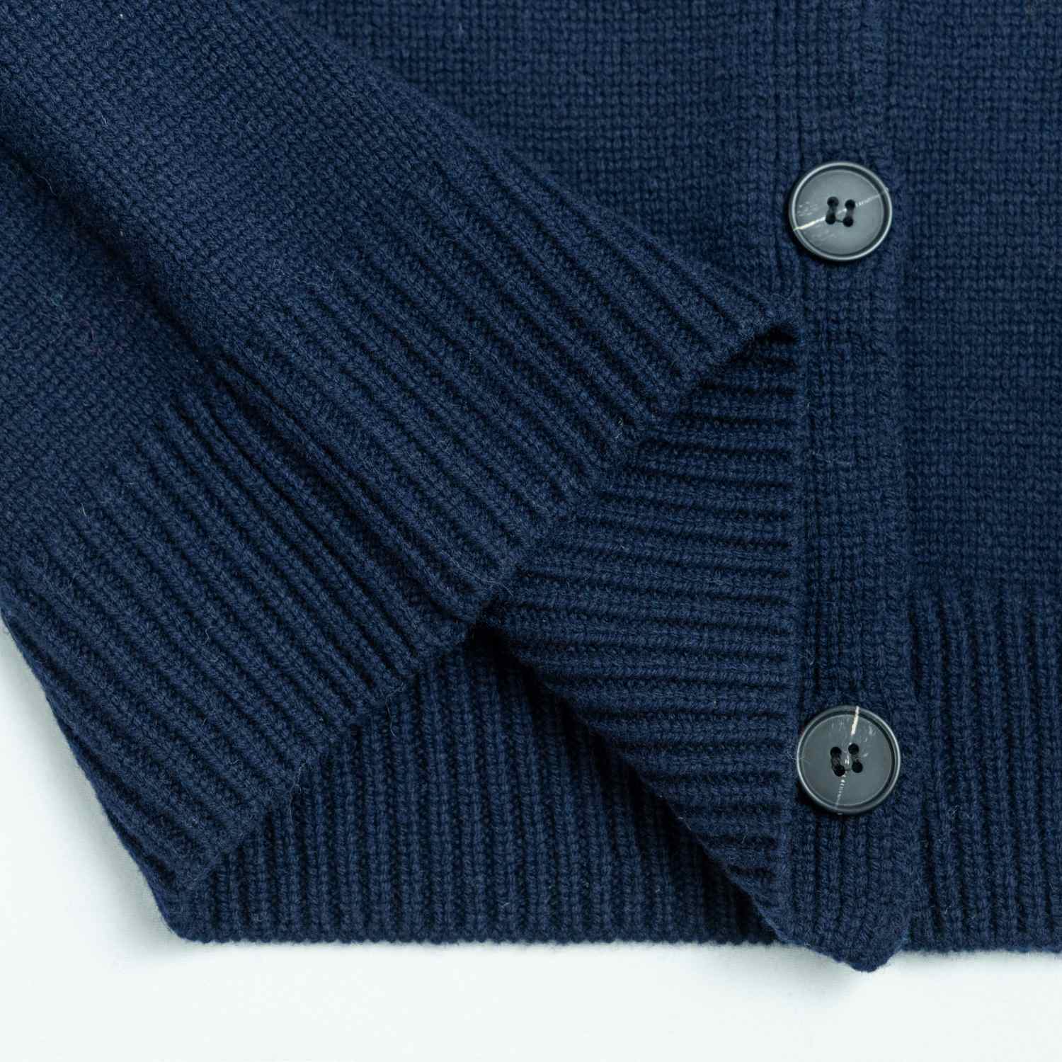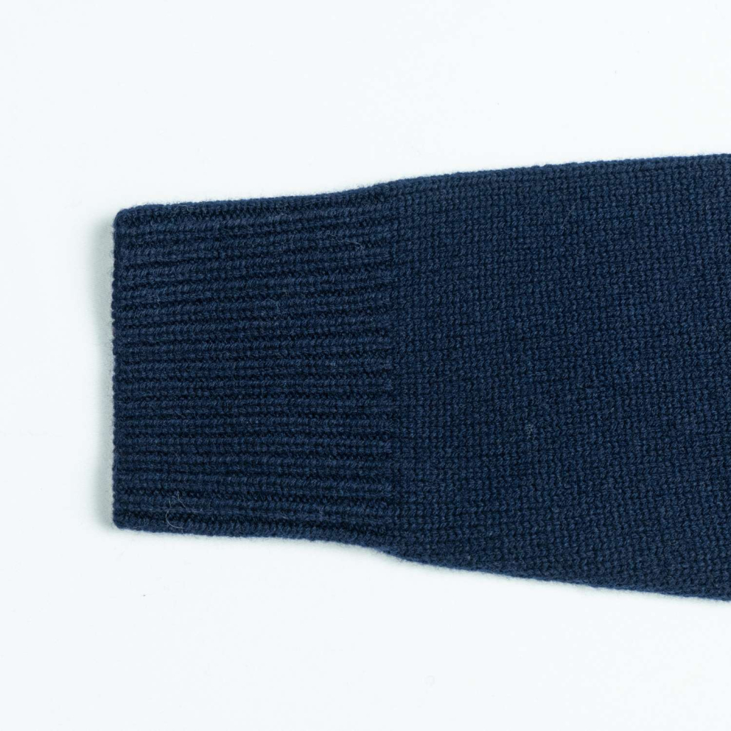 A timeless wool knit cardigan in a deep navy blue, featuring a sophisticated ribbed mock neck. This long-sleeve piece offers a clean, minimalist button-down design for versatile everyday layering.