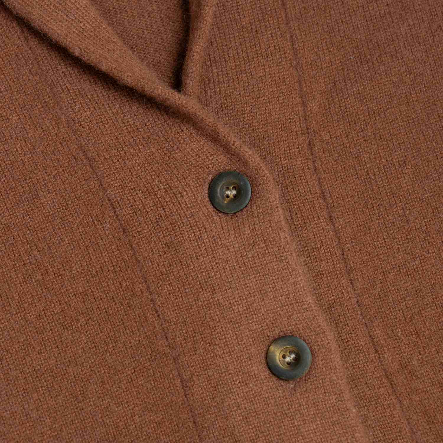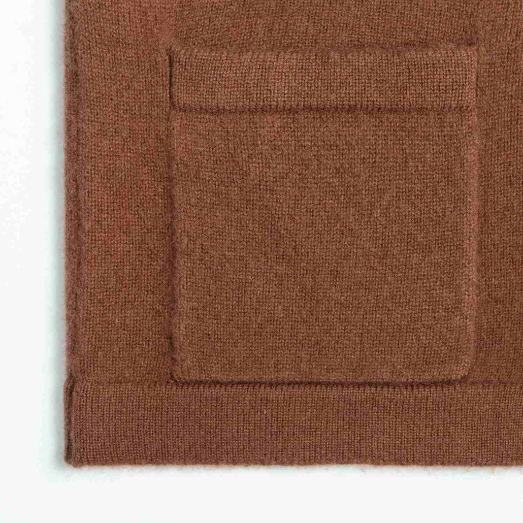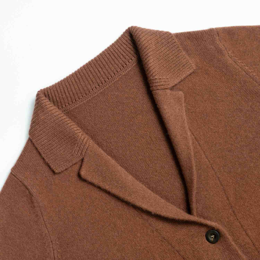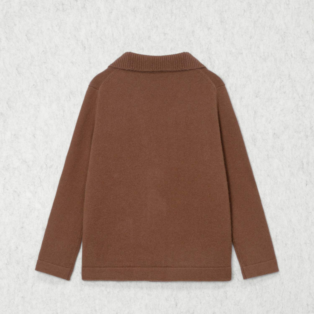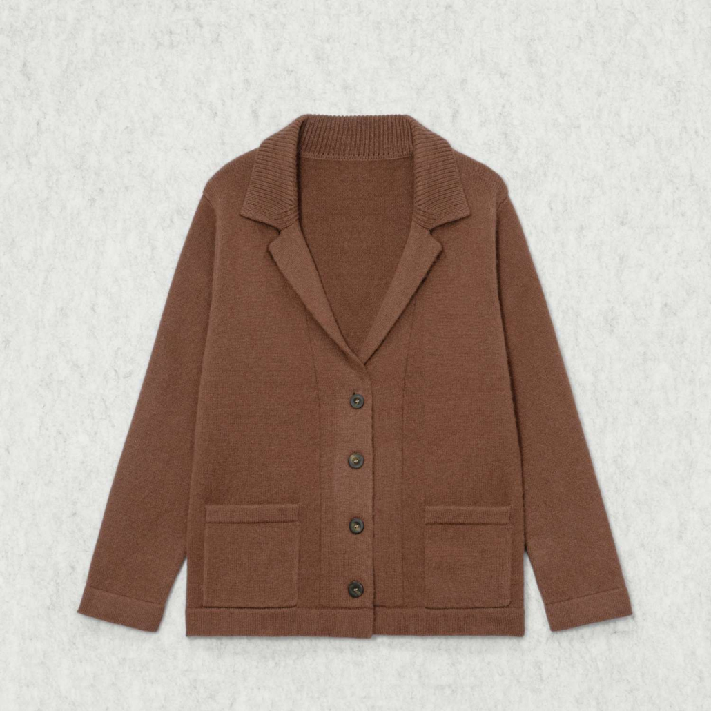 A sophisticated wool knit cardigan featuring a classic notch lapel and long sleeves. Detailed with functional front patch pockets and a button-down front in a warm chocolate brown.
