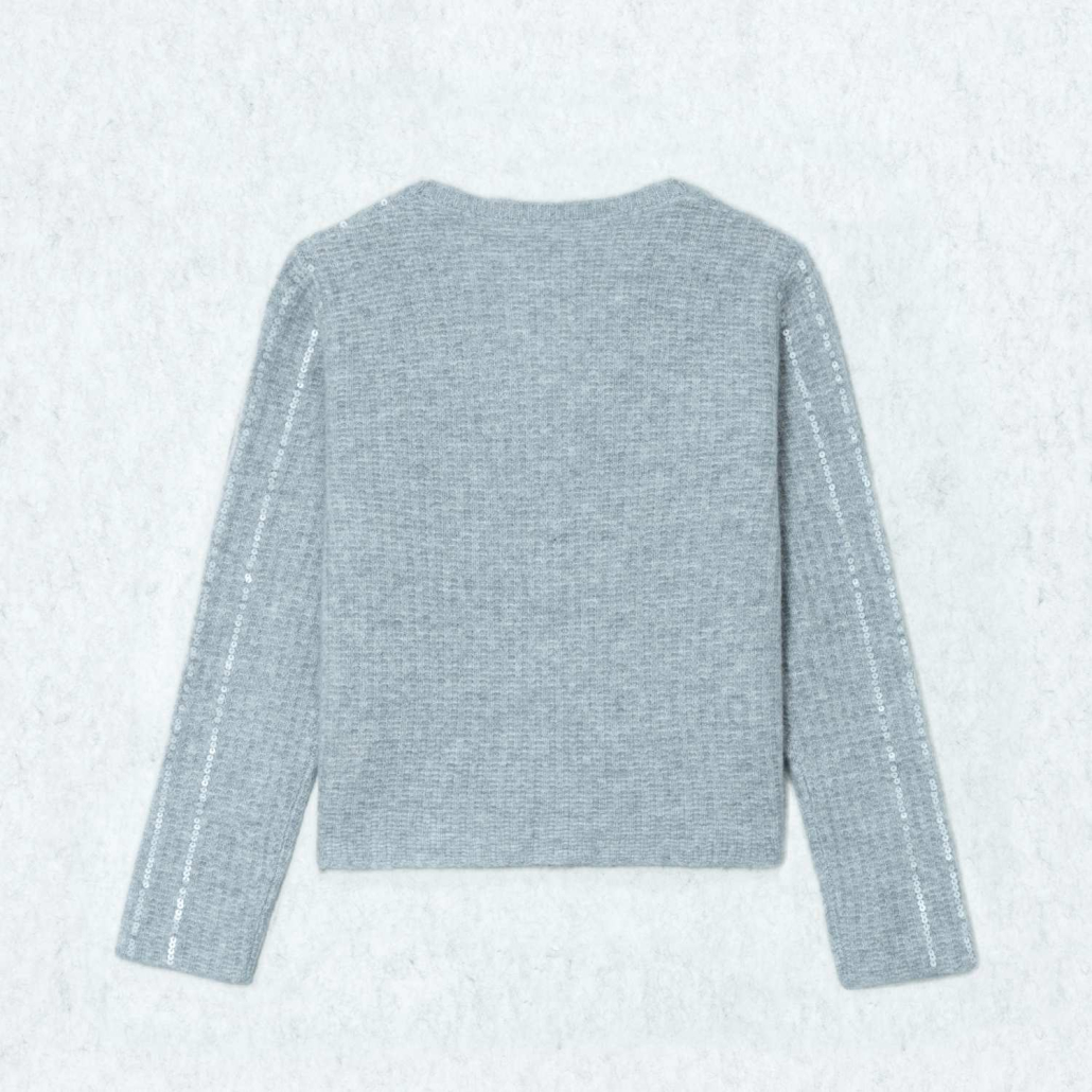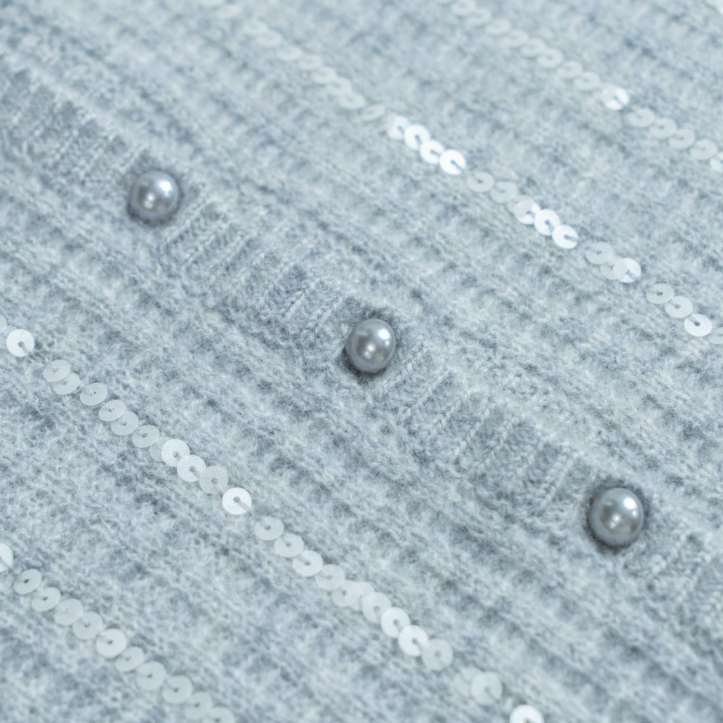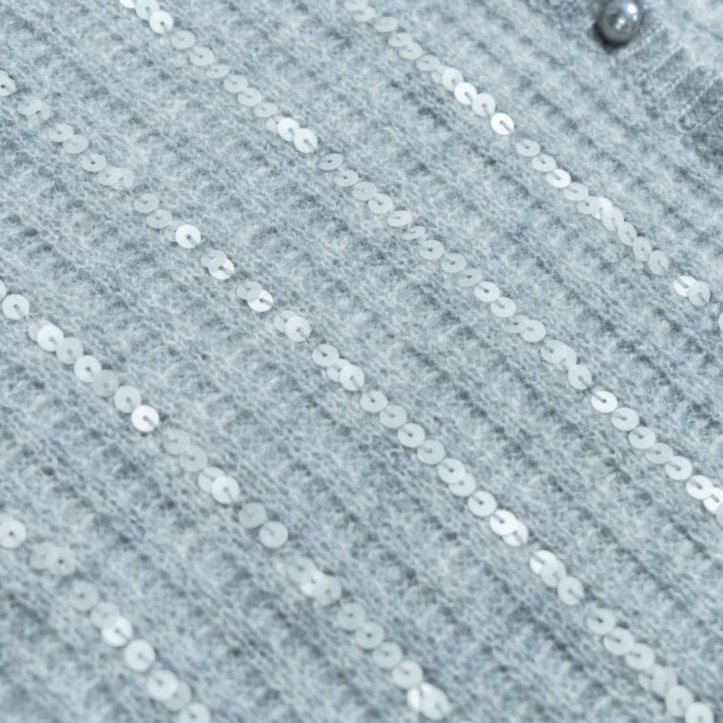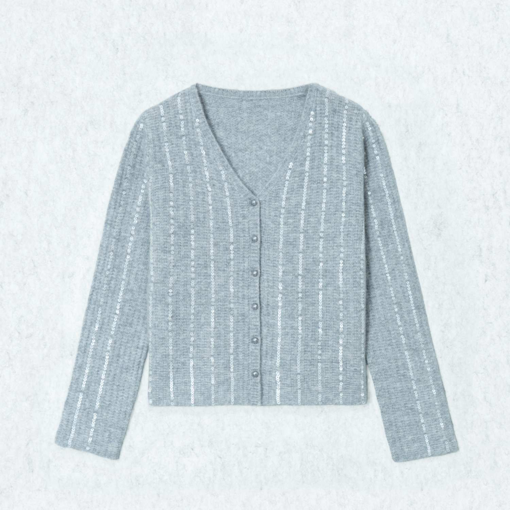 An elegant wool knit cardigan in light grey featuring shimmering vertical sequin stripes. Designed with a flattering V-neck, long sleeves, and tonal buttons for a sophisticated evening look.