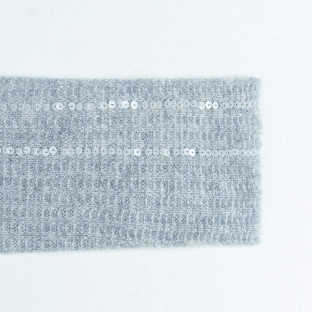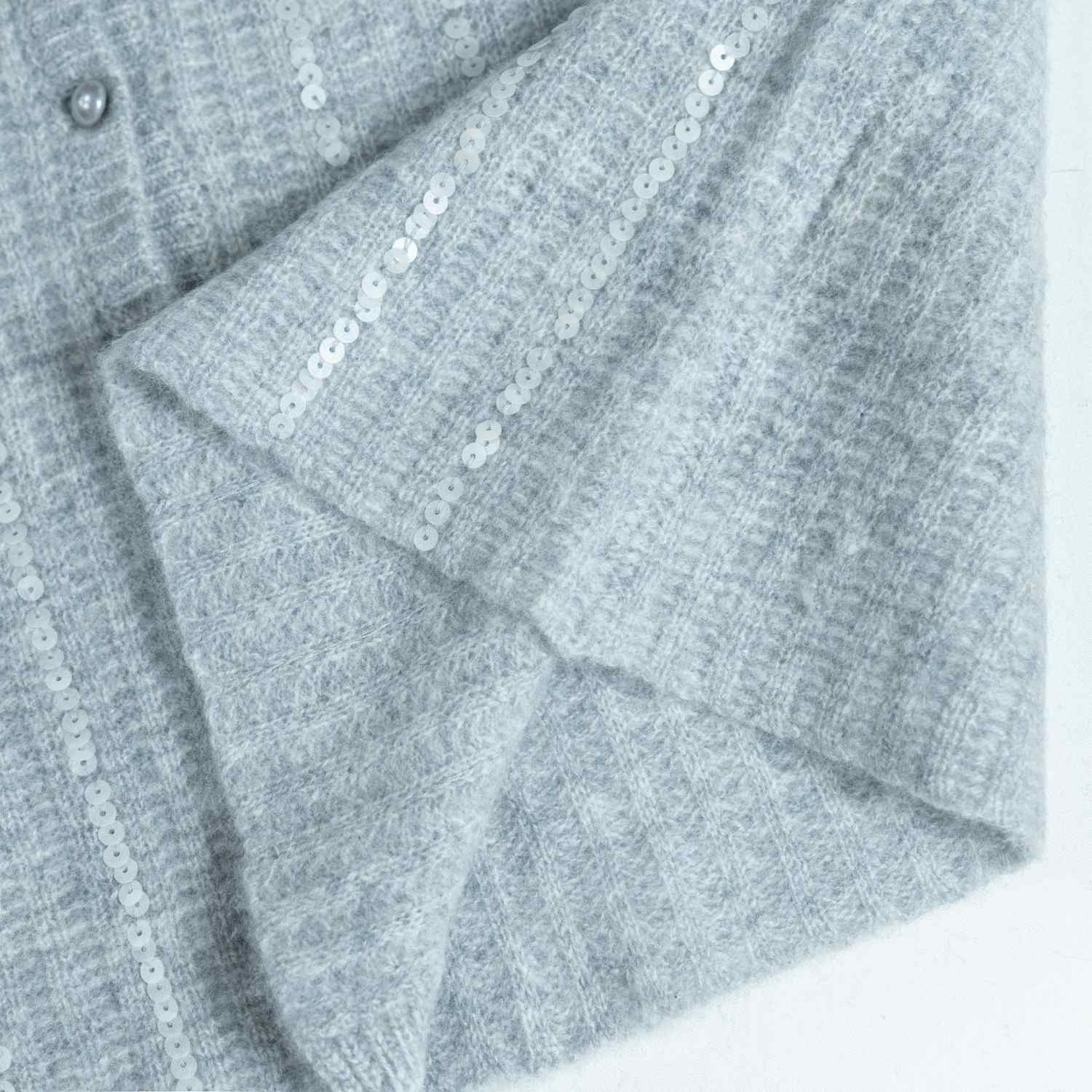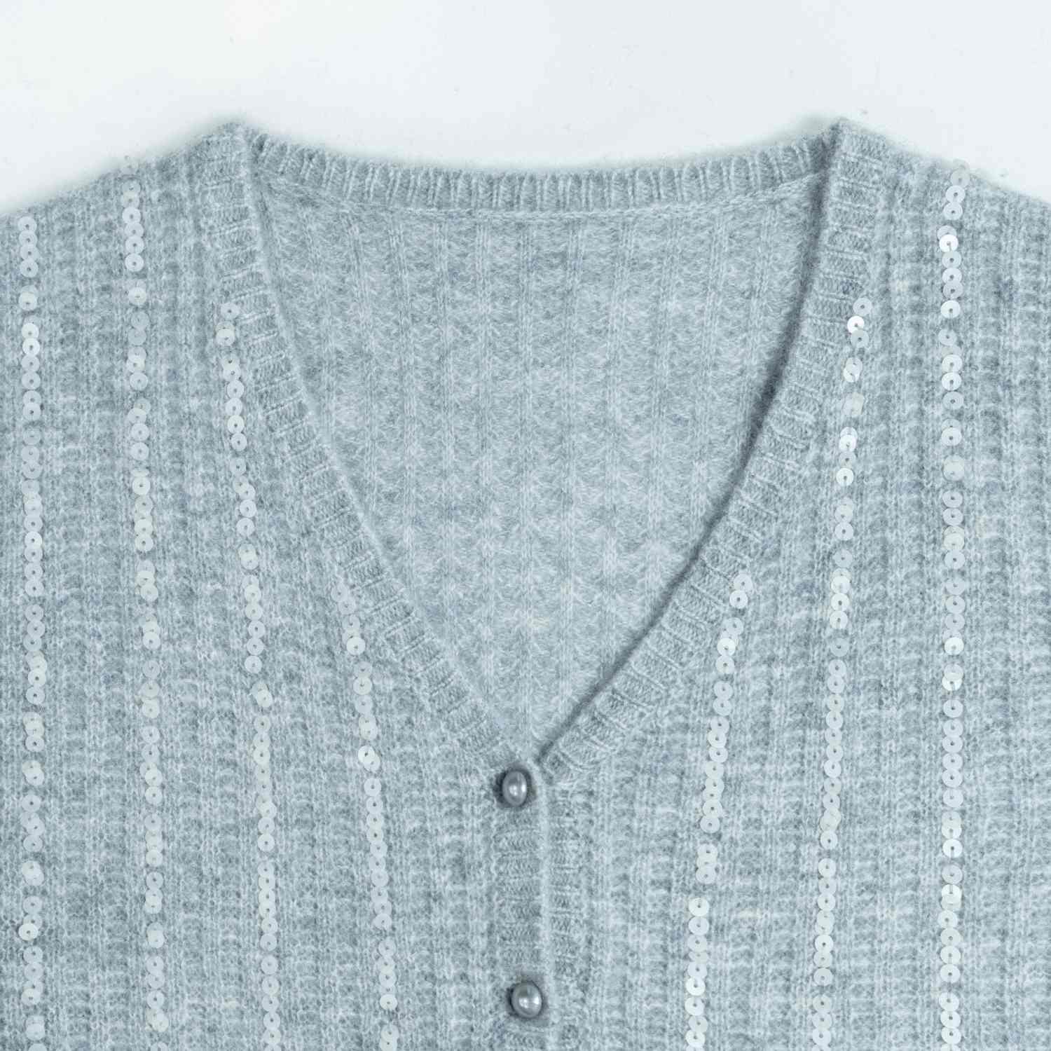 An elegant wool knit cardigan in light grey featuring shimmering vertical sequin stripes. Designed with a flattering V-neck, long sleeves, and tonal buttons for a sophisticated evening look.