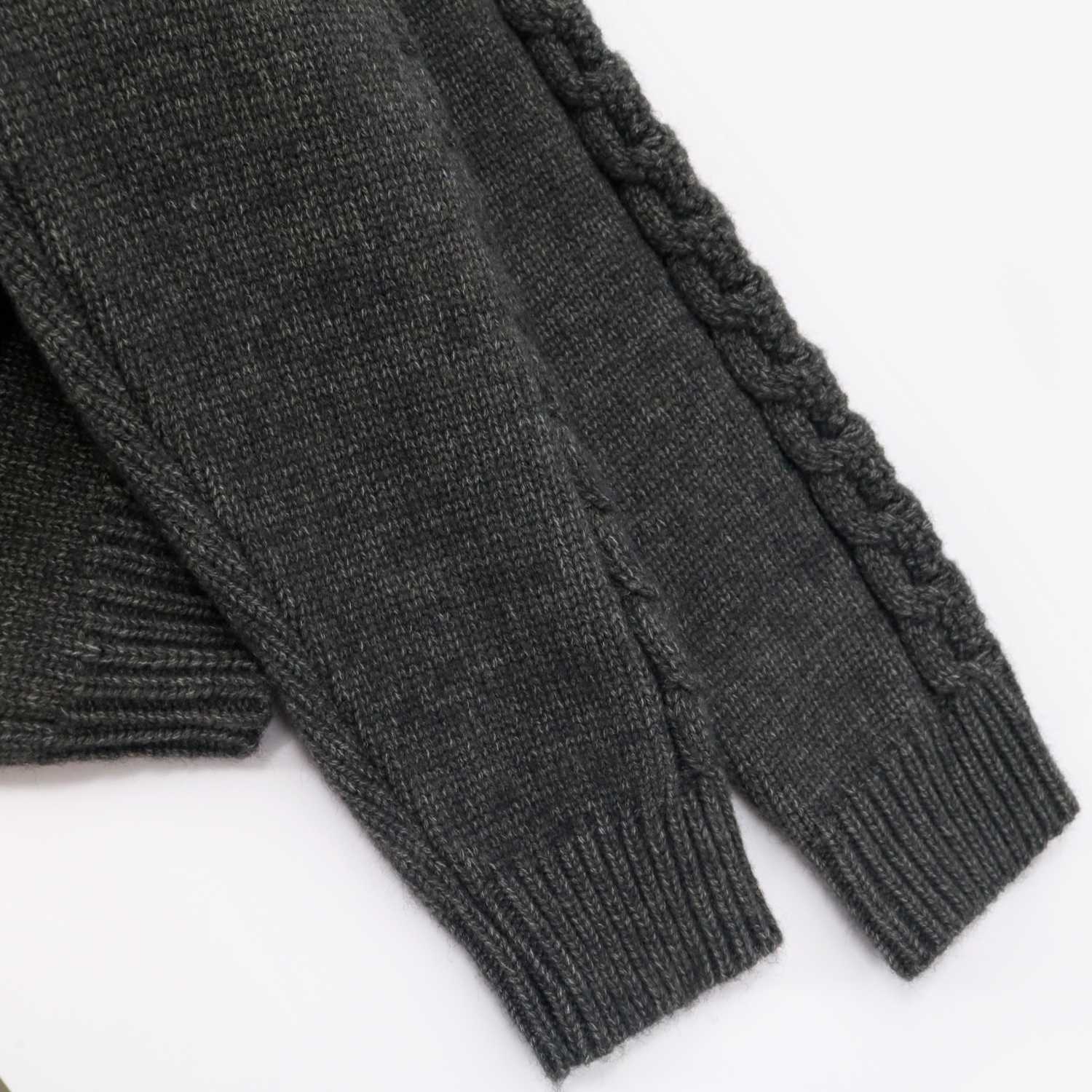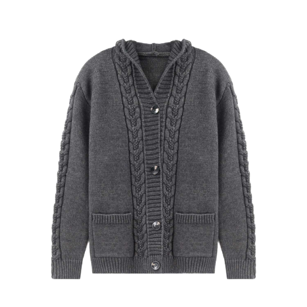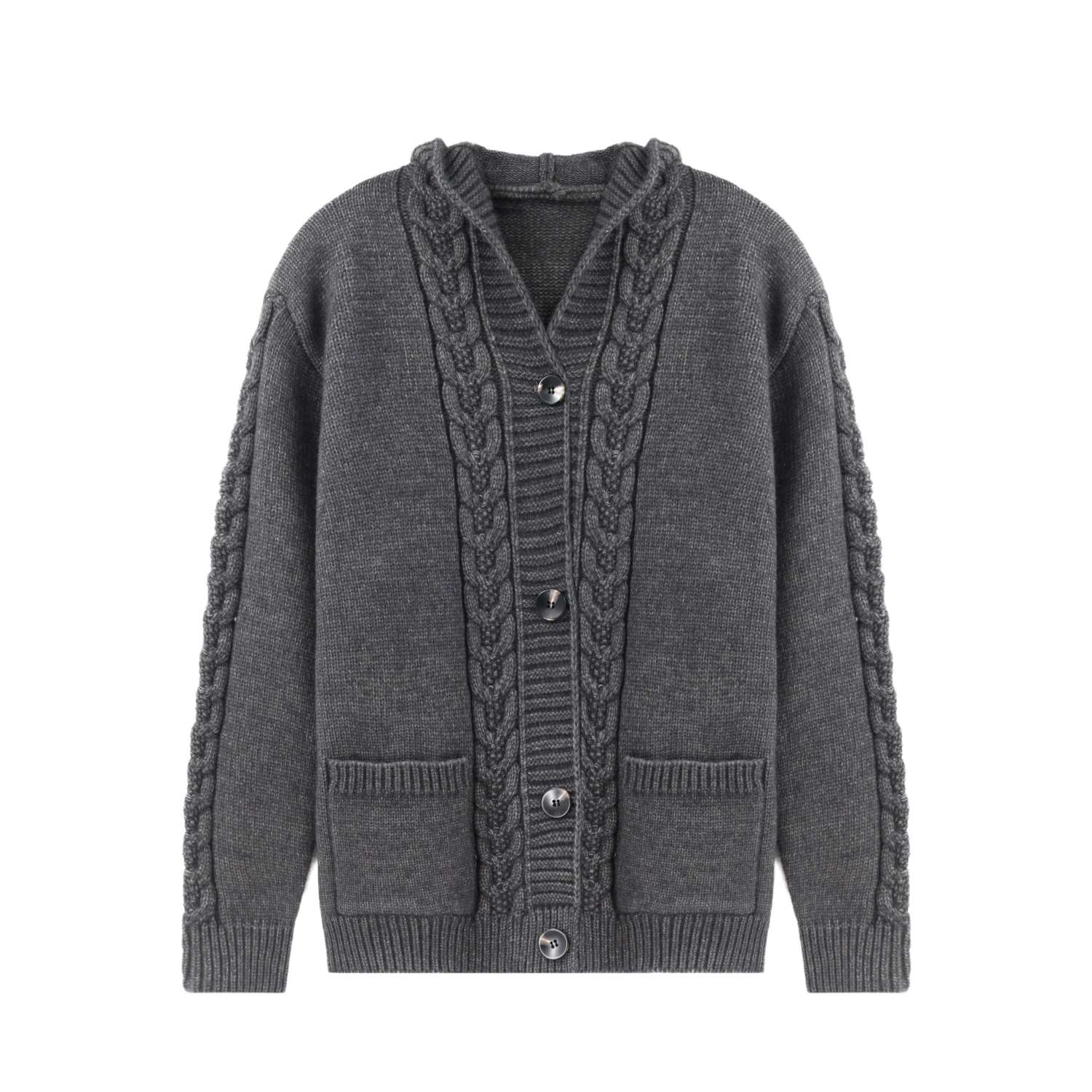 This knit cardigan is crafted from high-quality wool yarn and features a classic V-neck design with a full button front. The cable knit texture on the front panels adds depth and a strong vintage character, while the long sleeves provide warmth and structure. Perfect for autumn and winter collections, this style is ideal for bulk orders, OEM/ODM customization, and private label knitwear production.