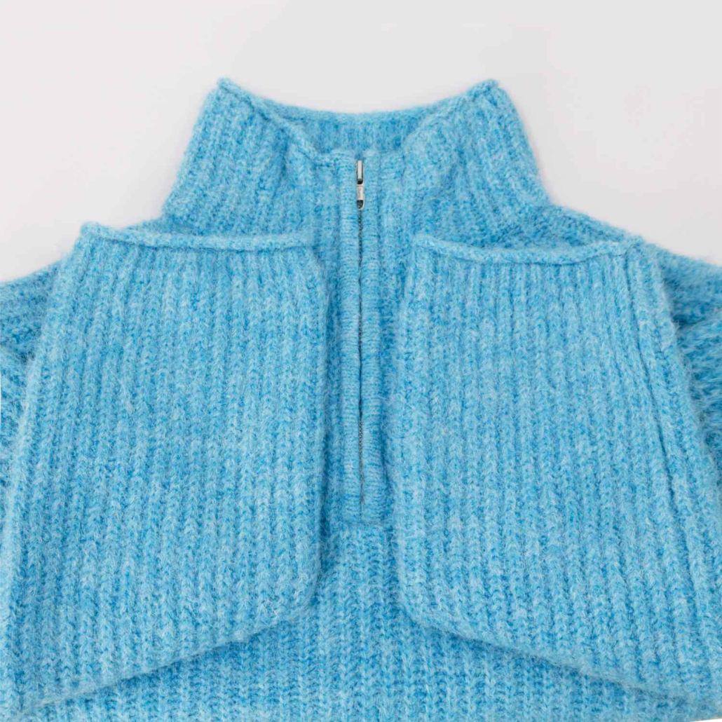 This knit pullover is made from soft wool yarn, featuring a half-zip collar design and relaxed long sleeves. The loose silhouette and cozy texture create a casual and modern look, perfect for autumn and winter collections. Ideal for bulk orders, OEM/ODM customization, and private label knitwear programs for women’s fashion lines.