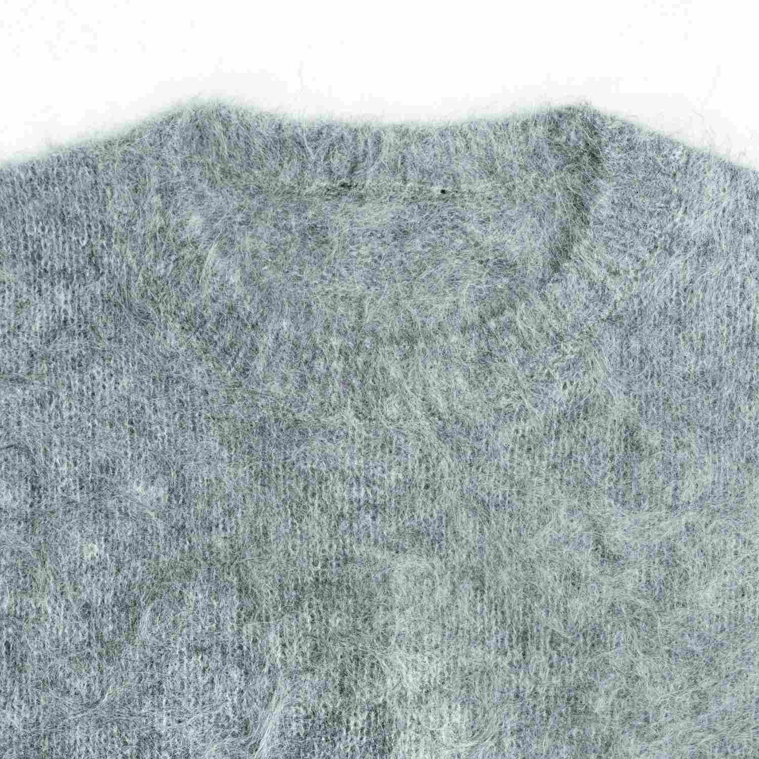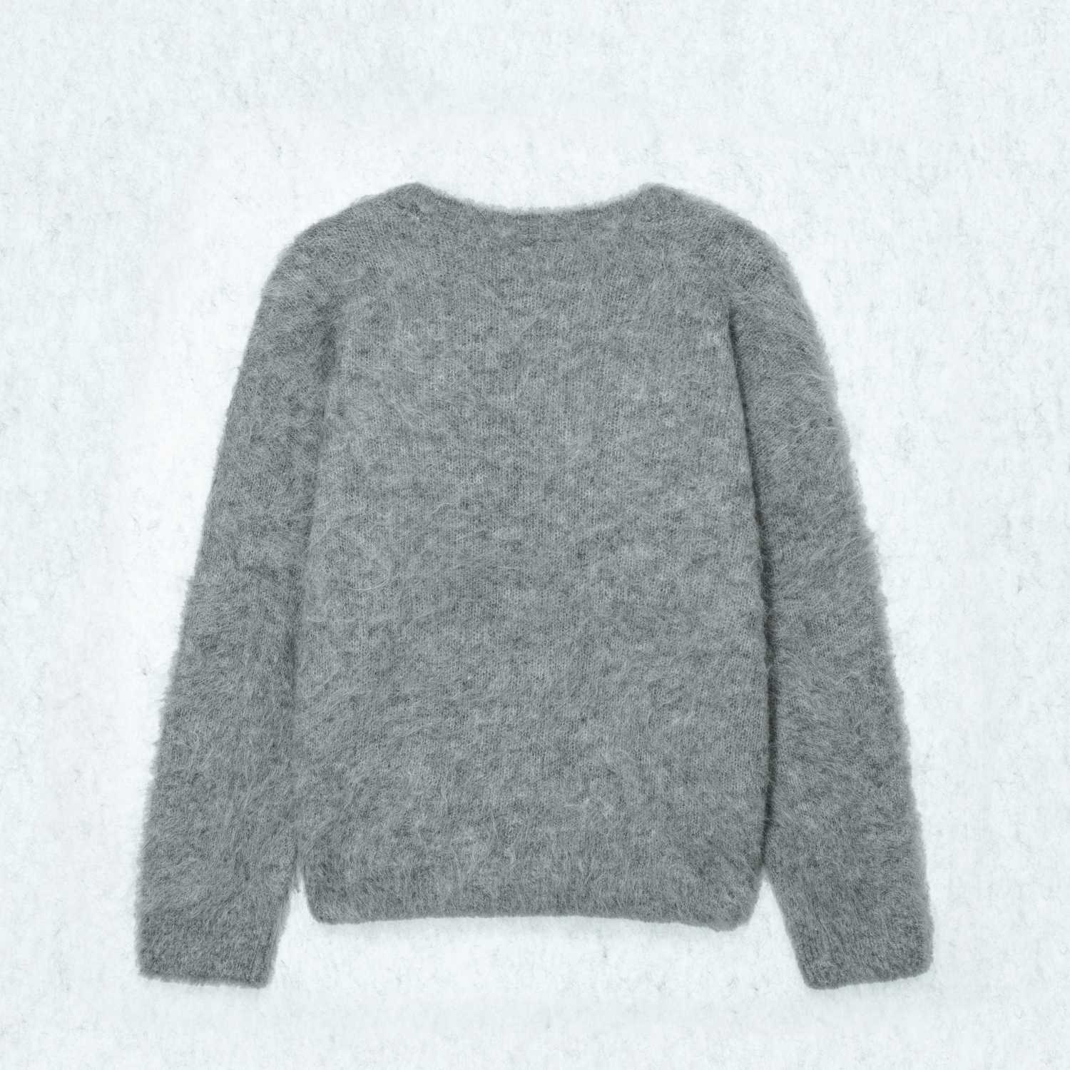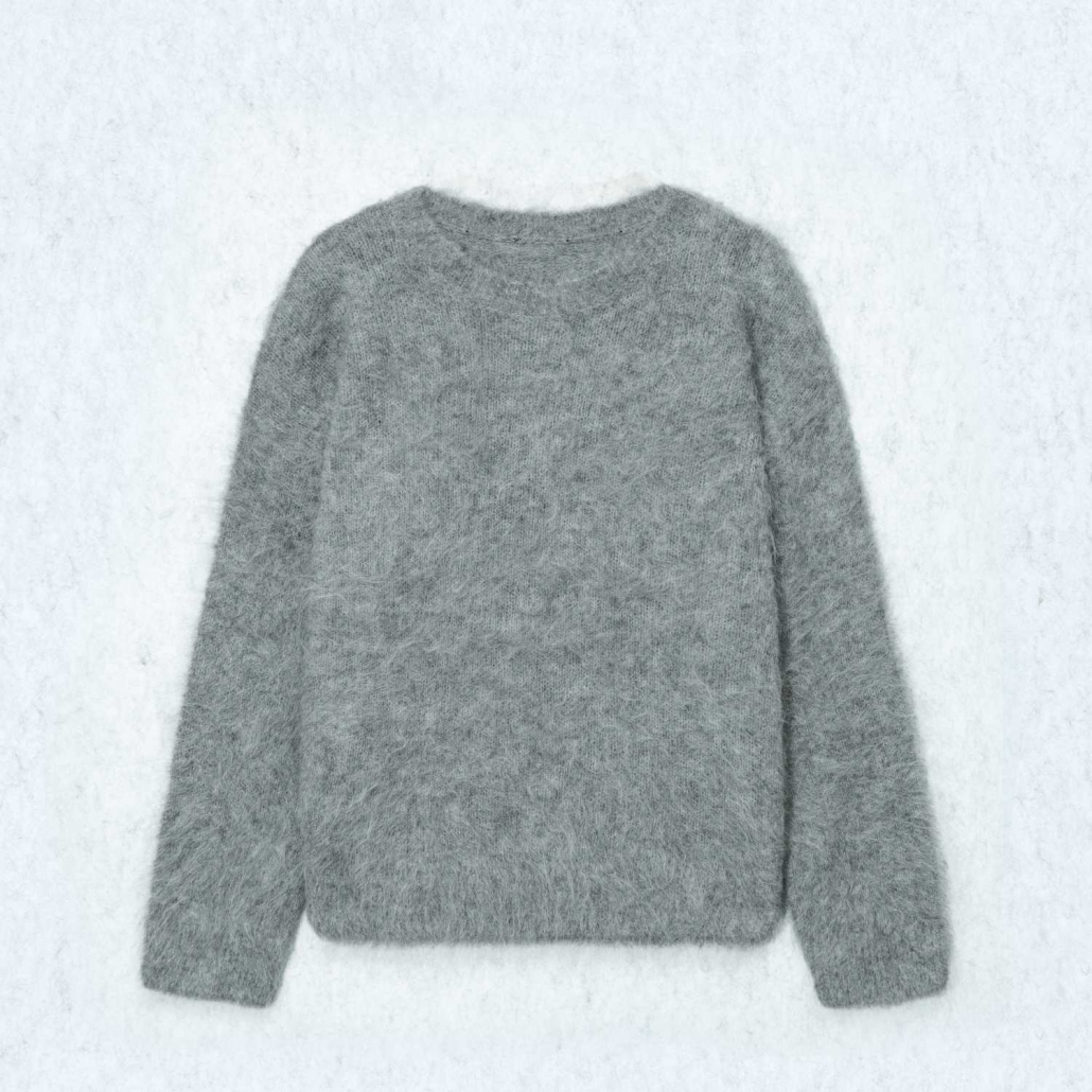 A cozy wool and mohair blend sweater featuring a soft, fuzzy texture in heather grey. Designed with a classic crewneck and long sleeves for a warm and stylish winter look.