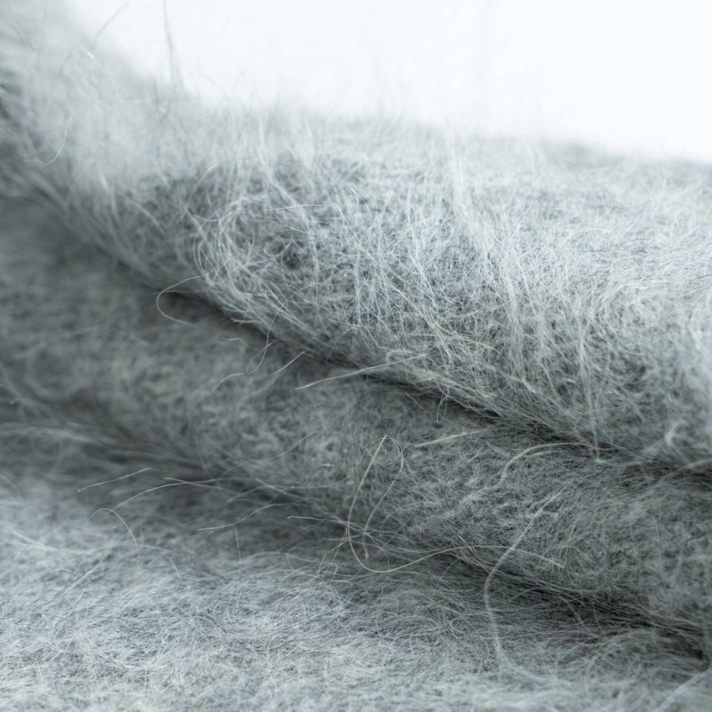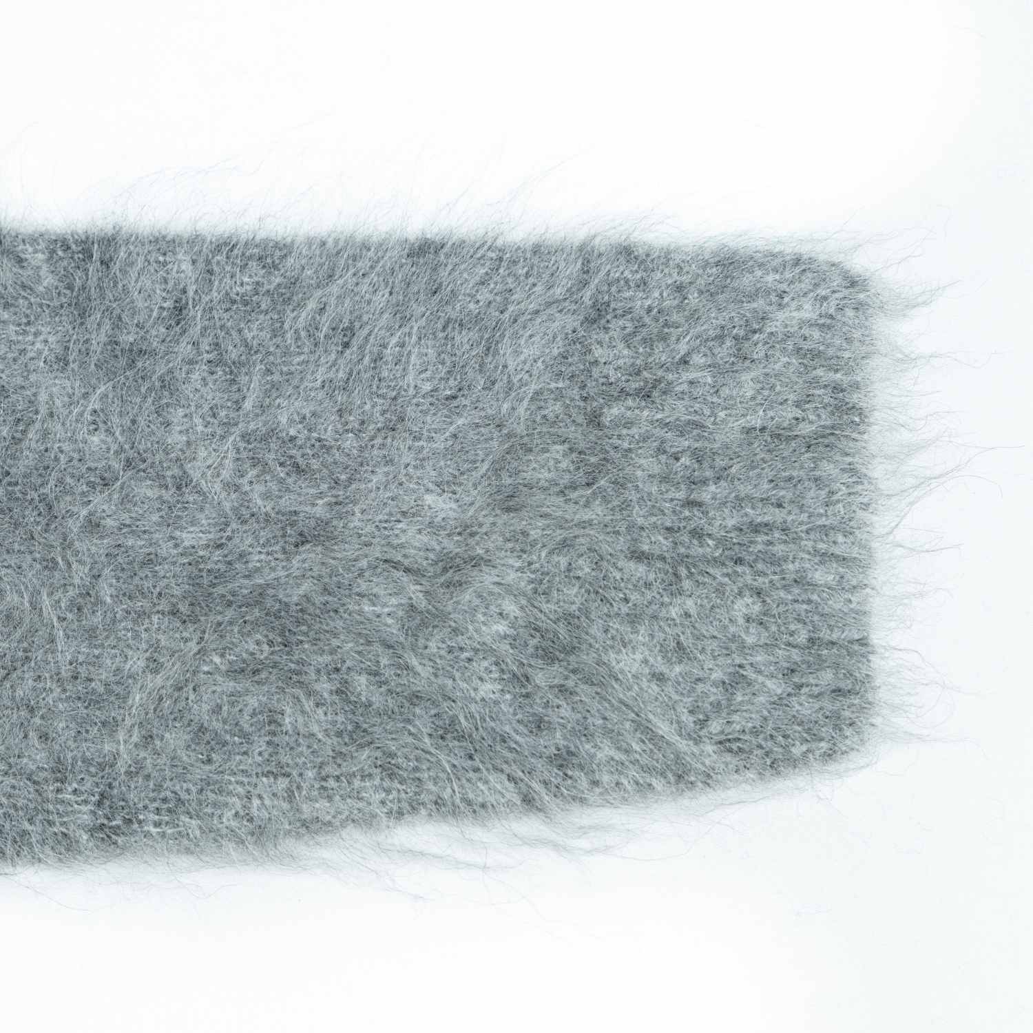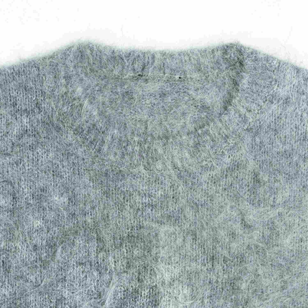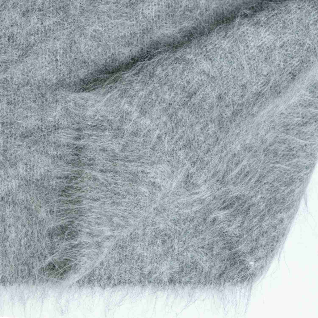 A cozy wool and mohair blend sweater featuring a soft, fuzzy texture in heather grey. Designed with a classic crewneck and long sleeves for a warm and stylish winter look.