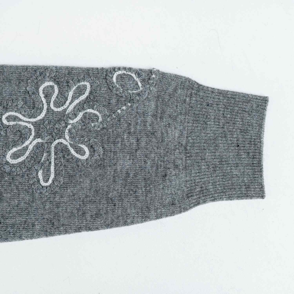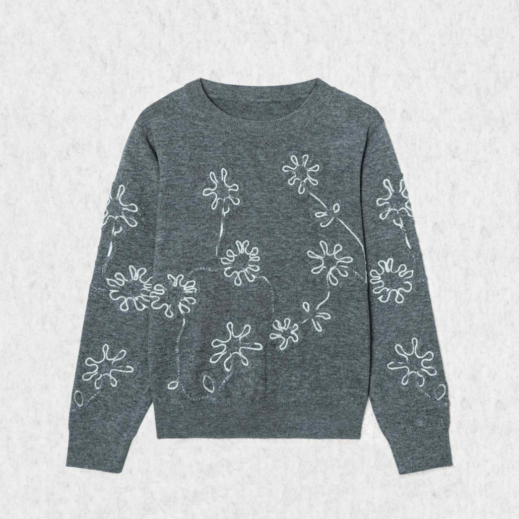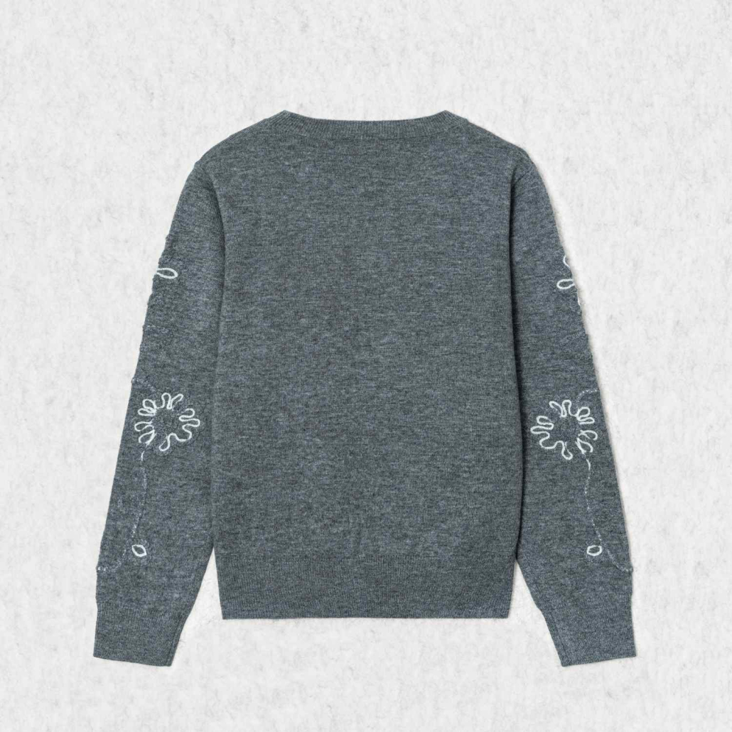 A modern wool knit sweater in charcoal grey featuring artistic white wire-style floral embroidery. Designed with a classic crewneck and long sleeves for a unique, graphic winter look.