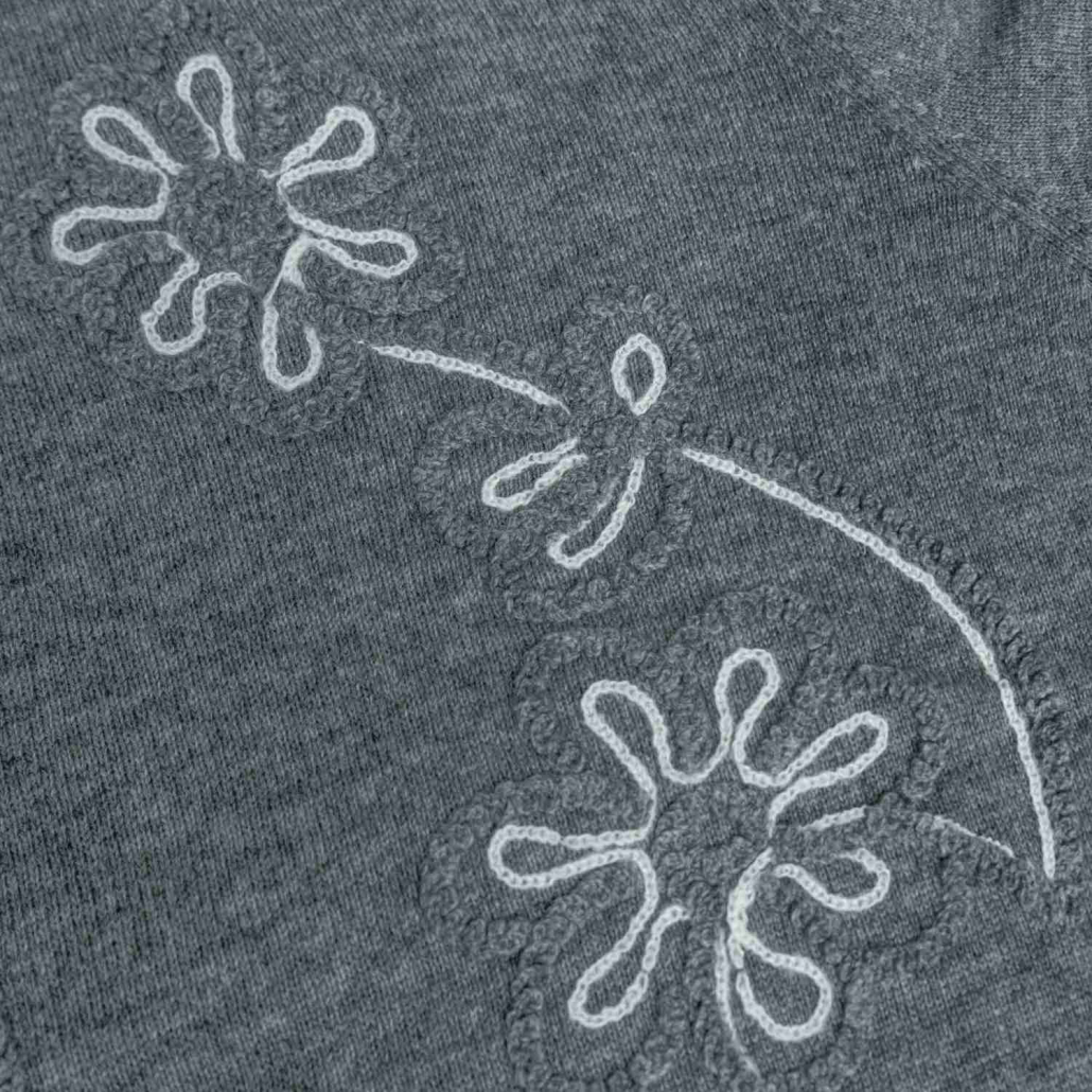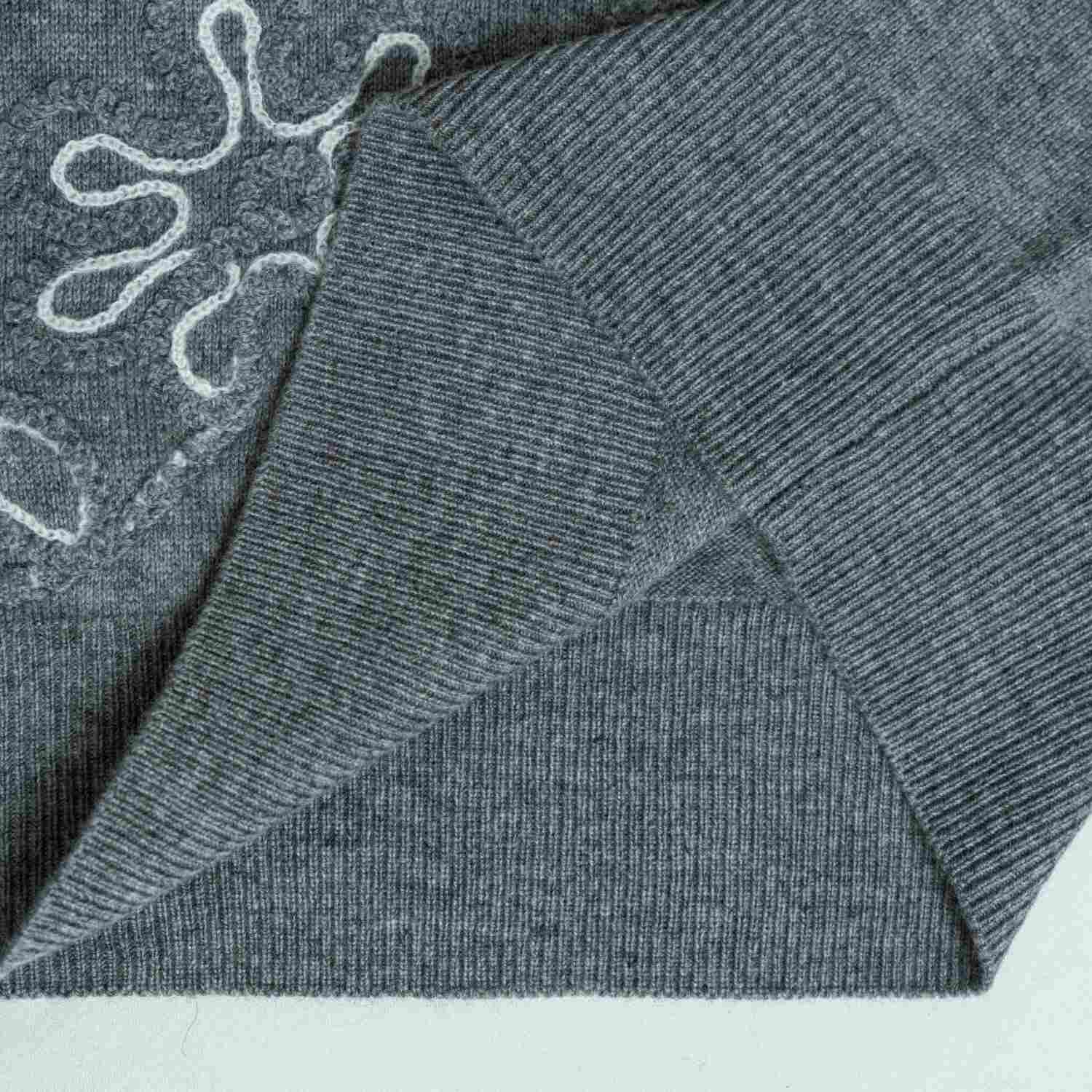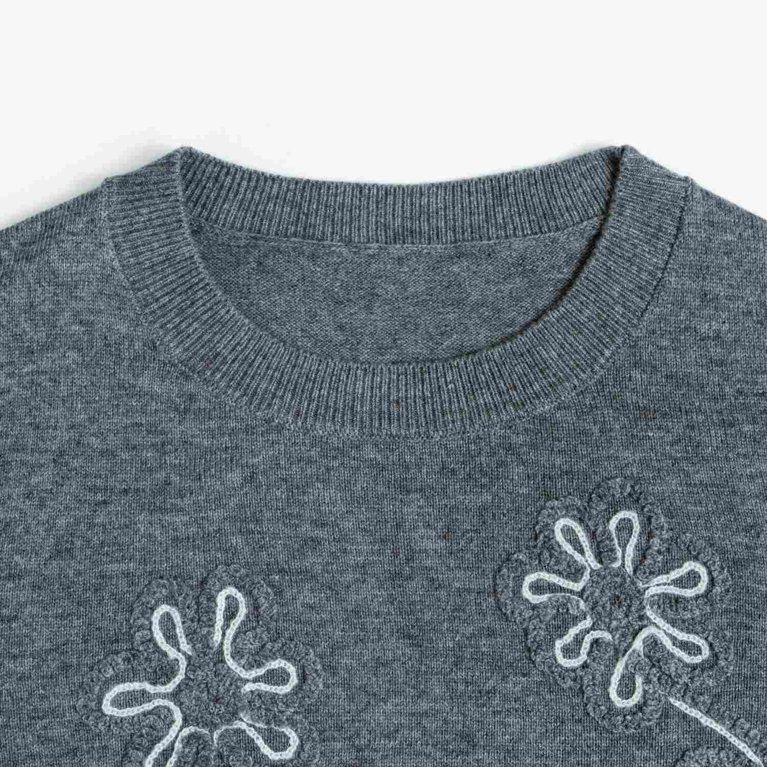 A modern wool knit sweater in charcoal grey featuring artistic white wire-style floral embroidery. Designed with a classic crewneck and long sleeves for a unique, graphic winter look.