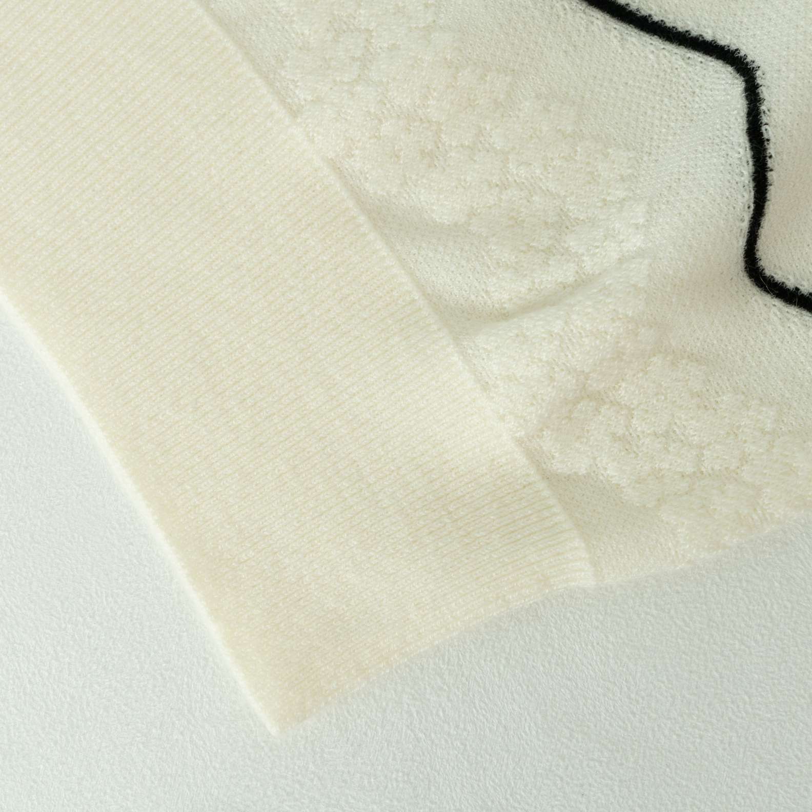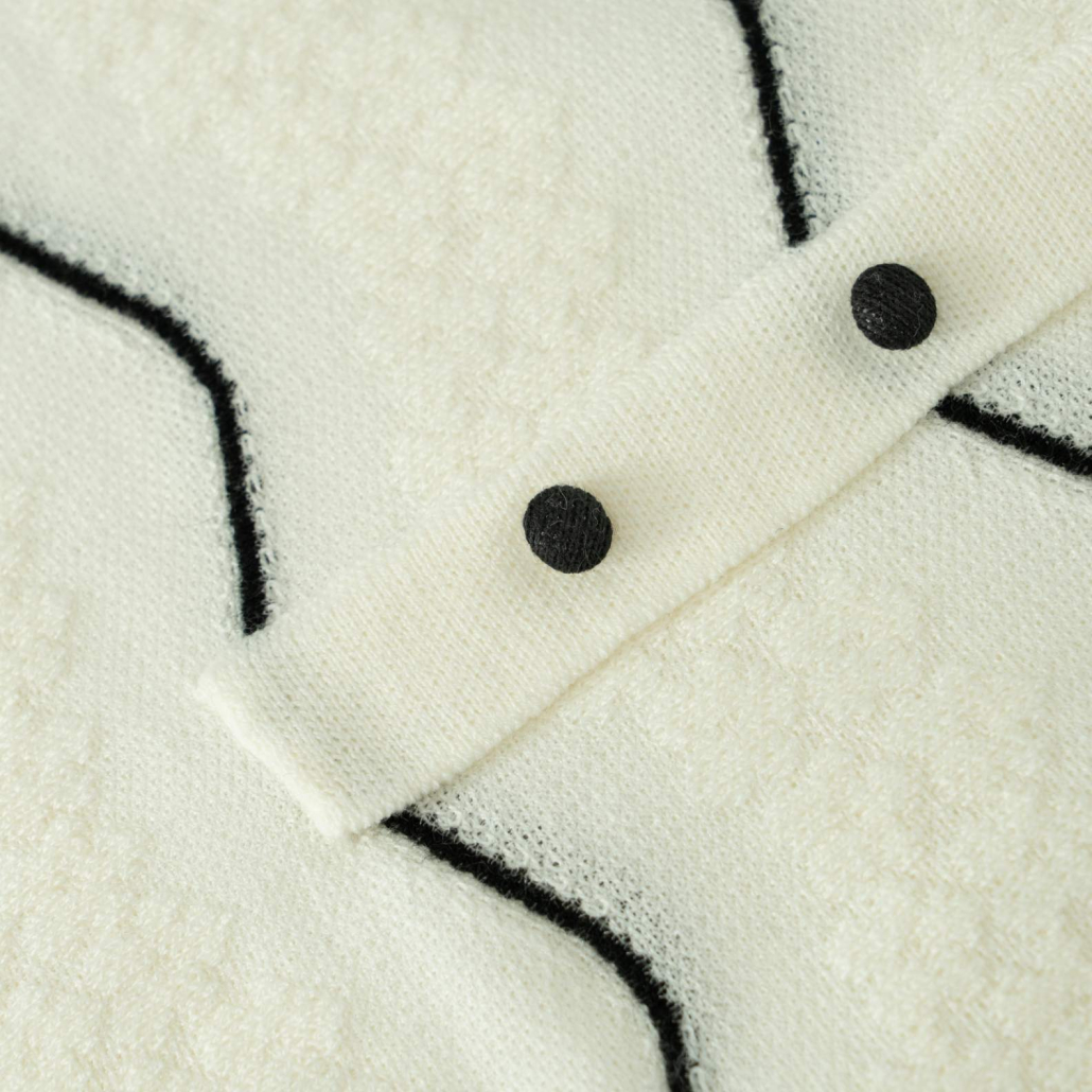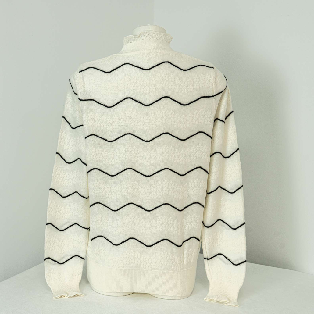 A chic wool knit sweater in ivory featuring graphic black wavy stripes. Detailed with a ruffled high neck, a buttoned placket, and a textured floral-knit body for a playful modern look.