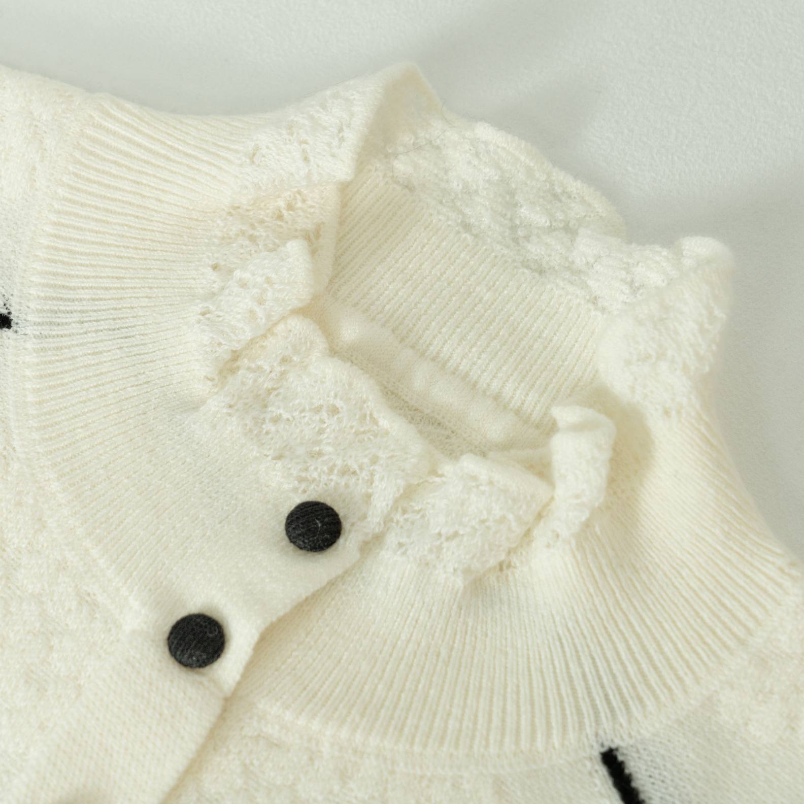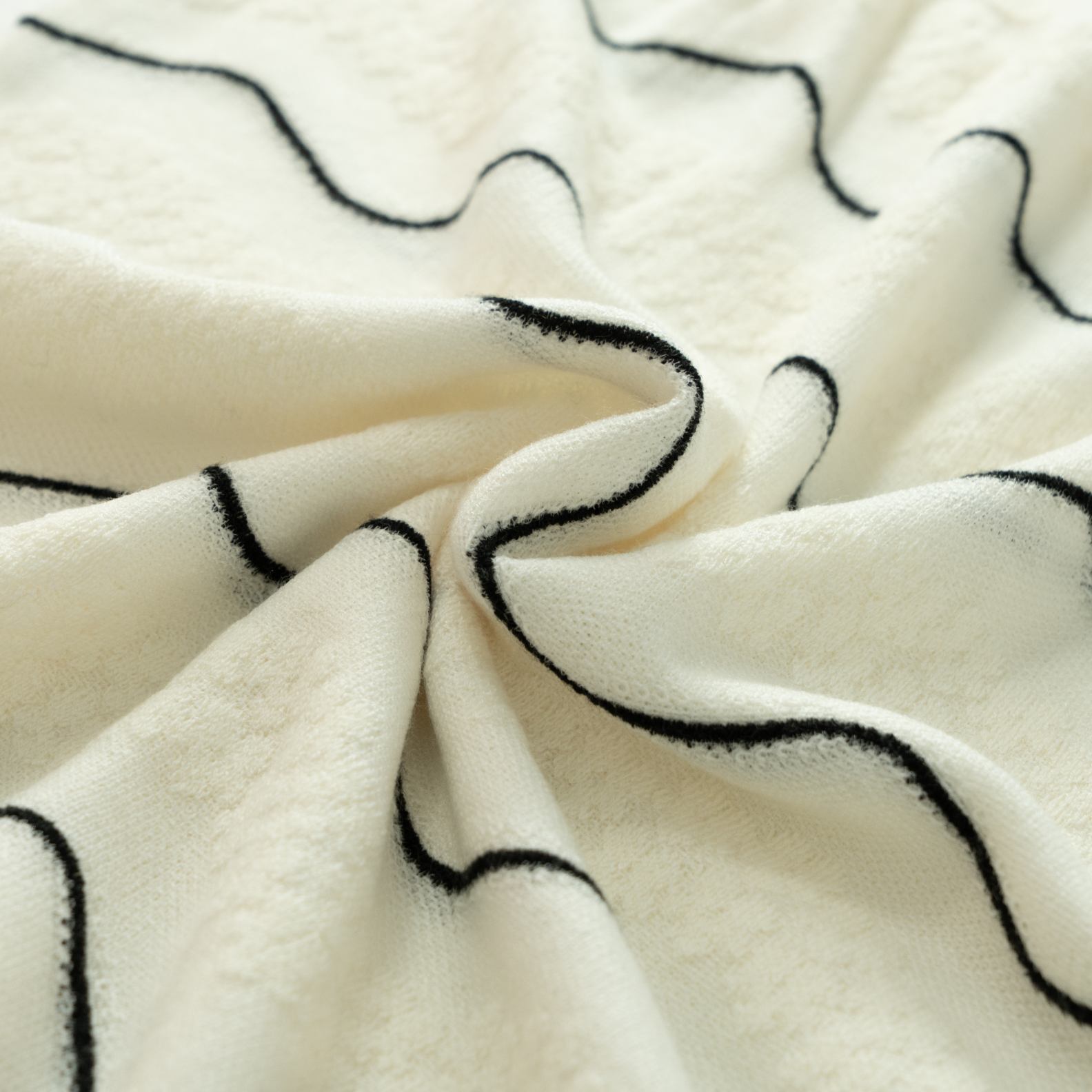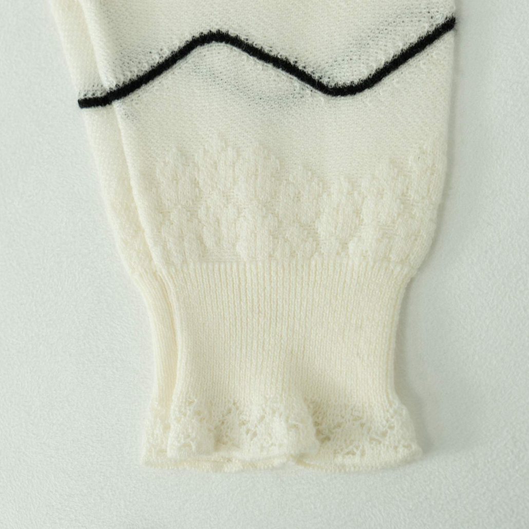 A chic wool knit sweater in ivory featuring graphic black wavy stripes. Detailed with a ruffled high neck, a buttoned placket, and a textured floral-knit body for a playful modern look.