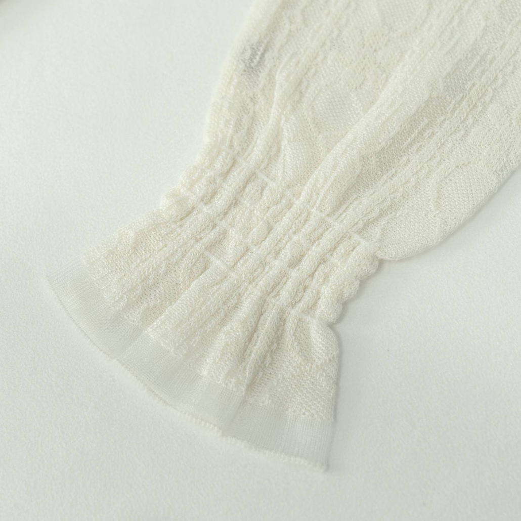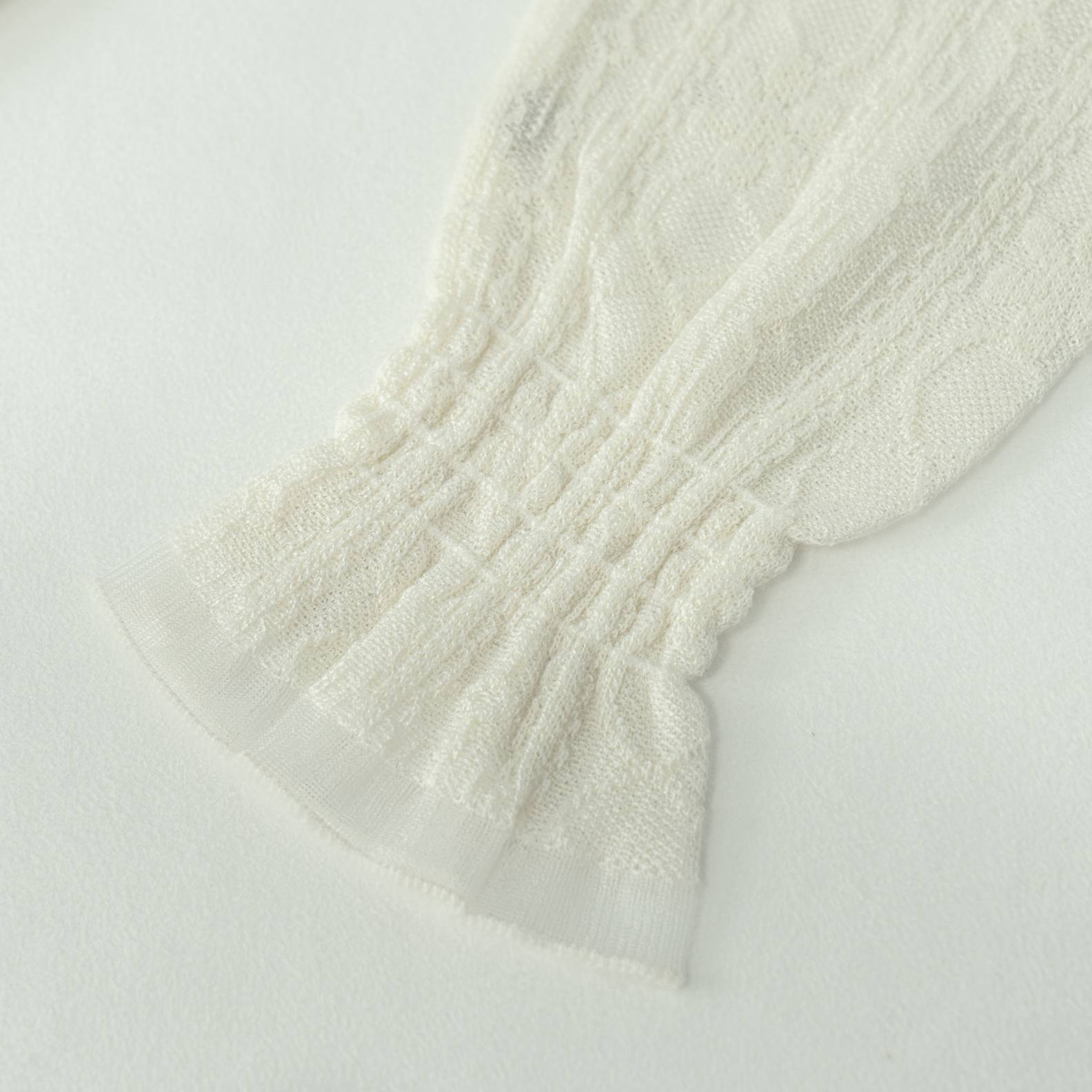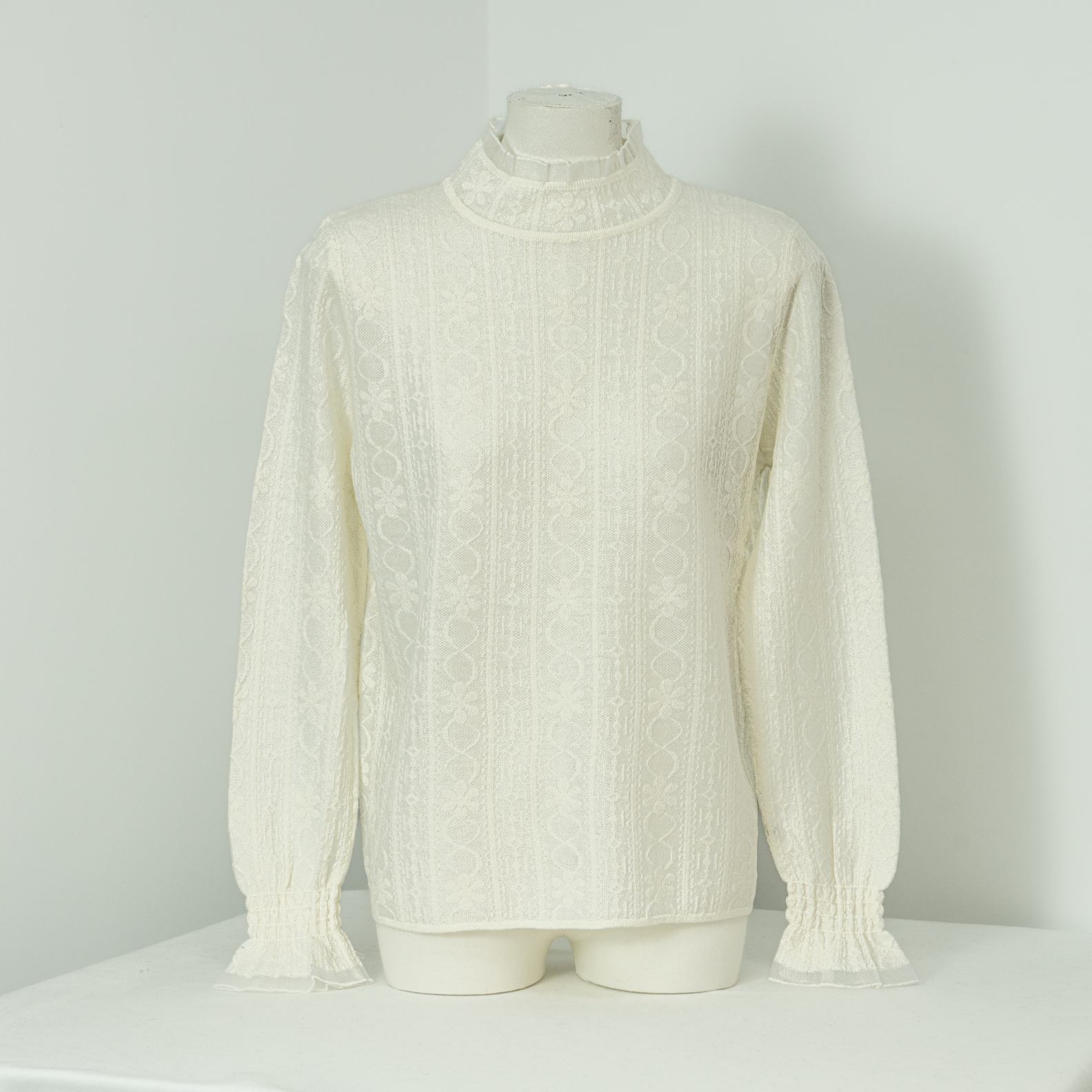 An elegant wool knit top in ivory featuring a delicate vertical floral lace texture. Designed with a ruffled high neck and smocked ruffle cuffs for a romantic, vintage-inspired look.