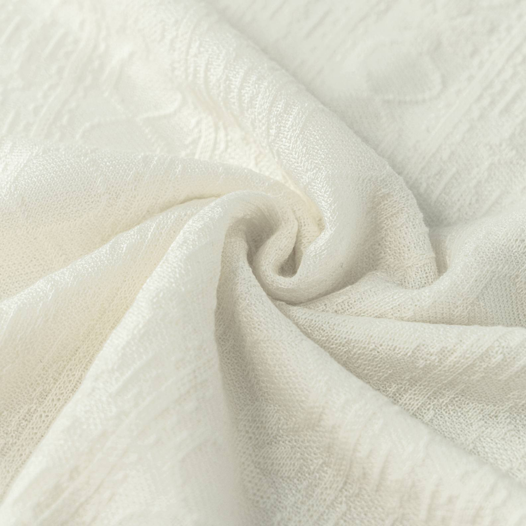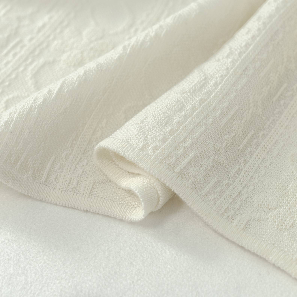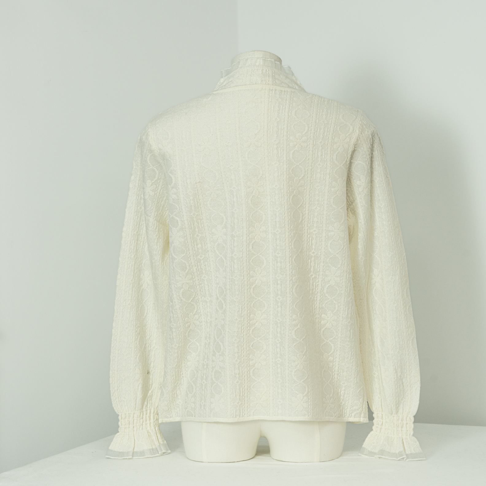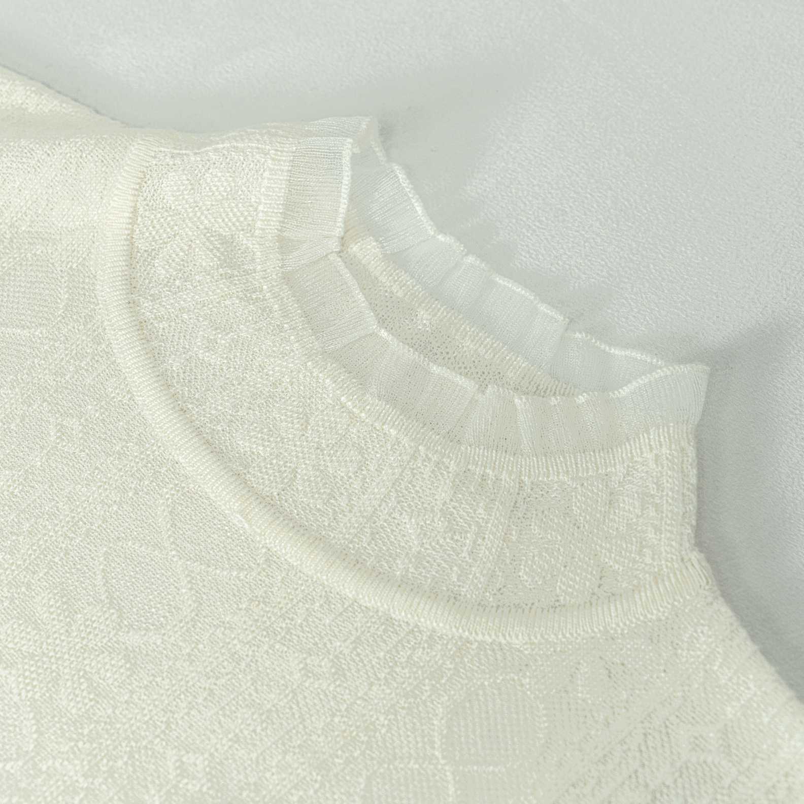 An elegant wool knit top in ivory featuring a delicate vertical floral lace texture. Designed with a ruffled high neck and smocked ruffle cuffs for a romantic, vintage-inspired look.