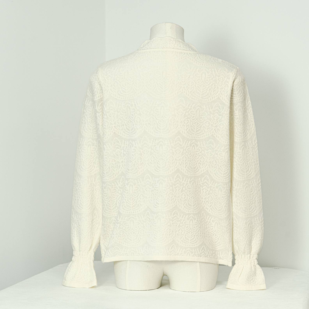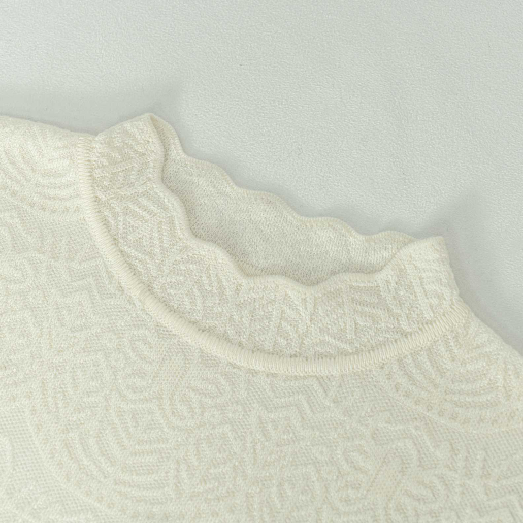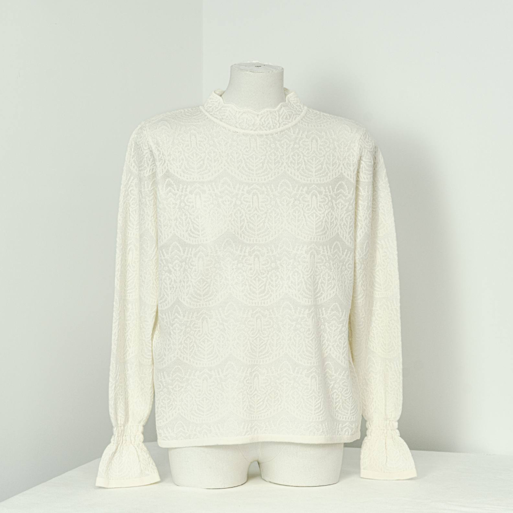 A sophisticated wool knit top in ivory, featuring an intricate all-over geometric textured pattern. Designed with a scalloped high neck and smocked bell cuffs for a refined, vintage-inspired silhouette.
