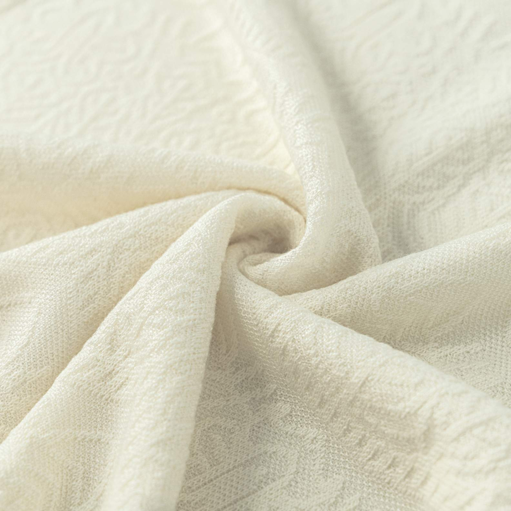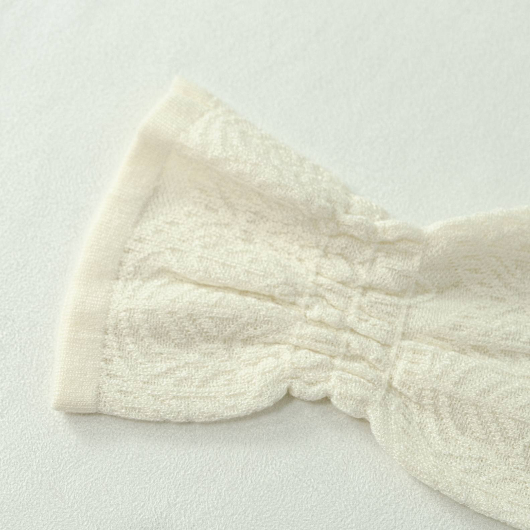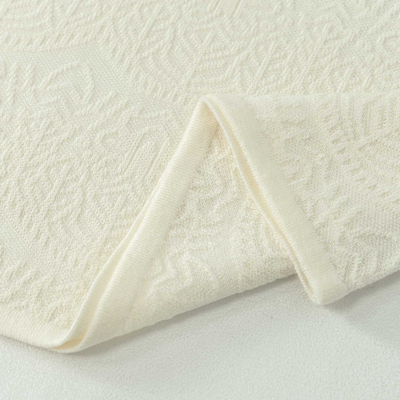 A sophisticated wool knit top in ivory, featuring an intricate all-over geometric textured pattern. Designed with a scalloped high neck and smocked bell cuffs for a refined, vintage-inspired silhouette.