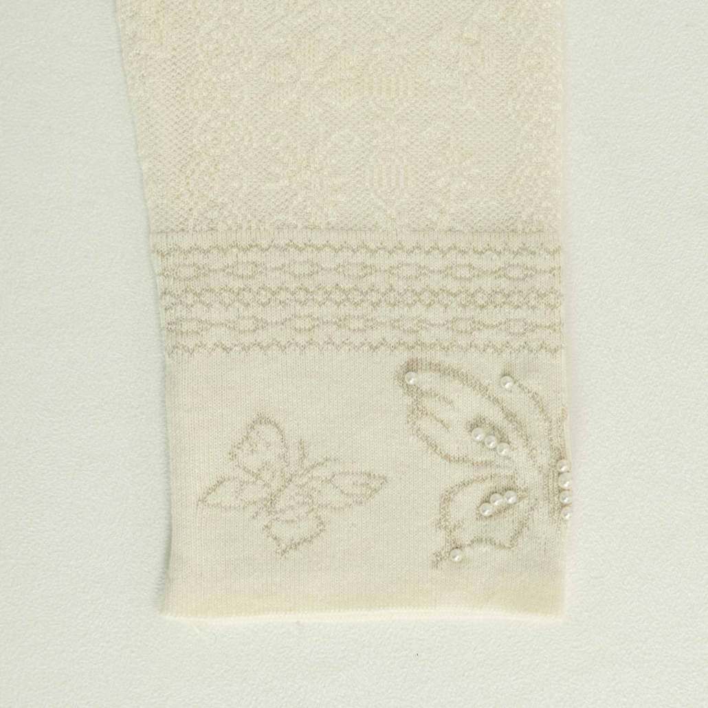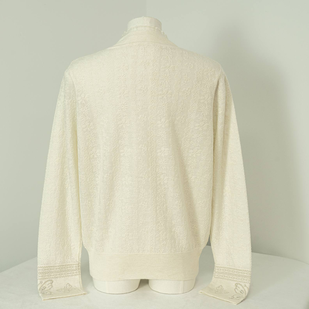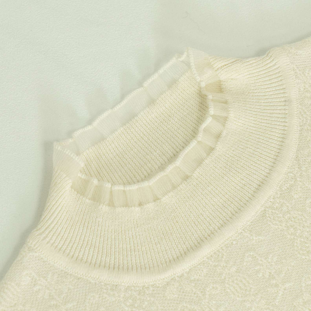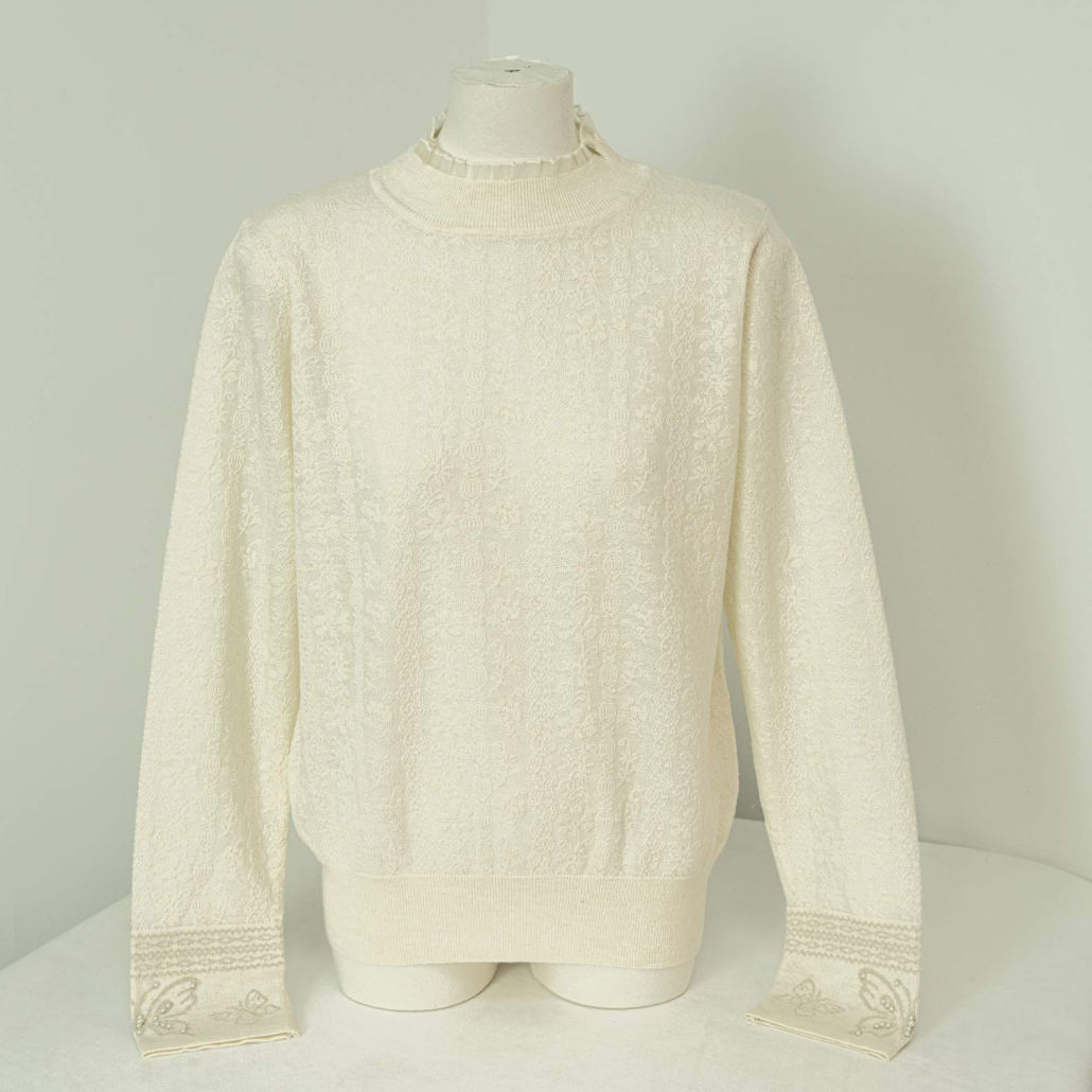 A graceful wool knit sweater in ivory featuring a delicate all-over tonal textured pattern. Finished with a ruffled mock neck and intricate pearl-embellished butterfly embroidery at the cuffs.