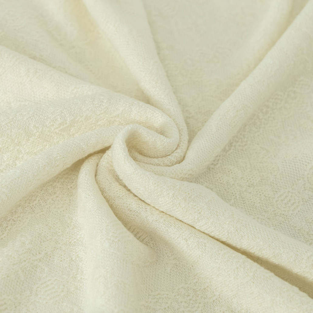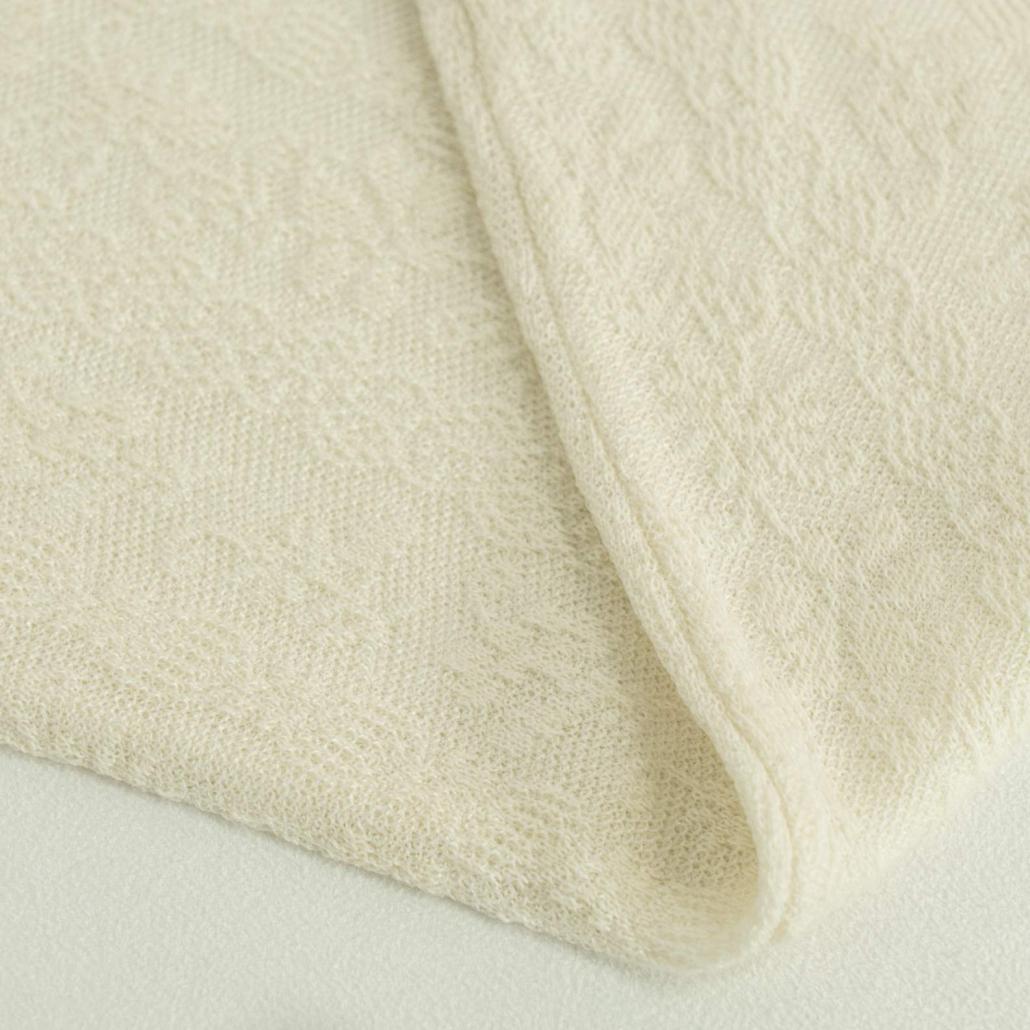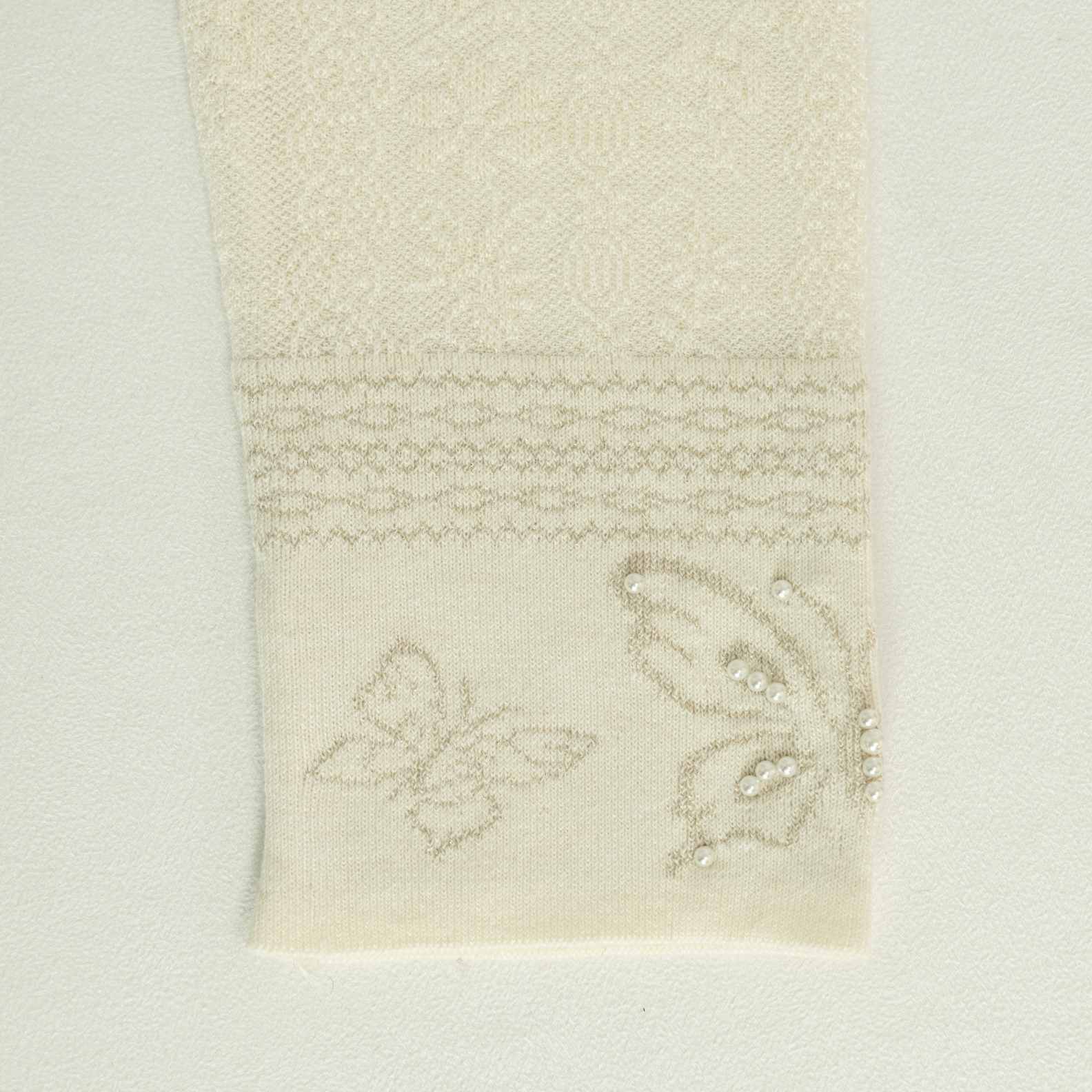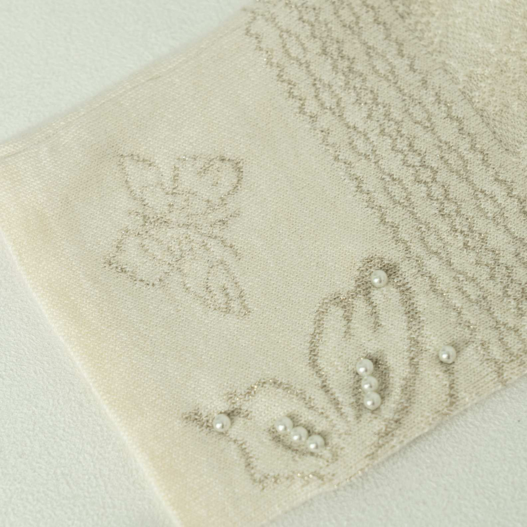 A graceful wool knit sweater in ivory featuring a delicate all-over tonal textured pattern. Finished with a ruffled mock neck and intricate pearl-embellished butterfly embroidery at the cuffs.