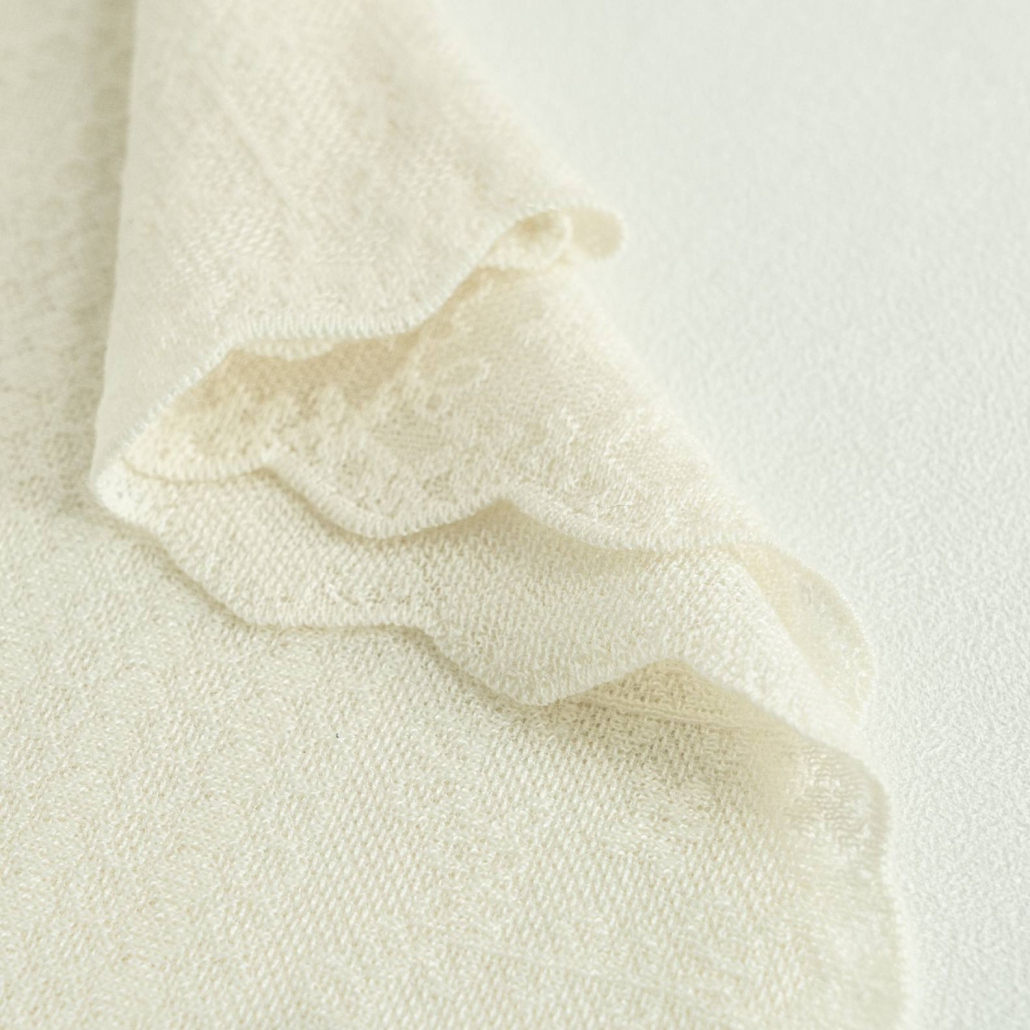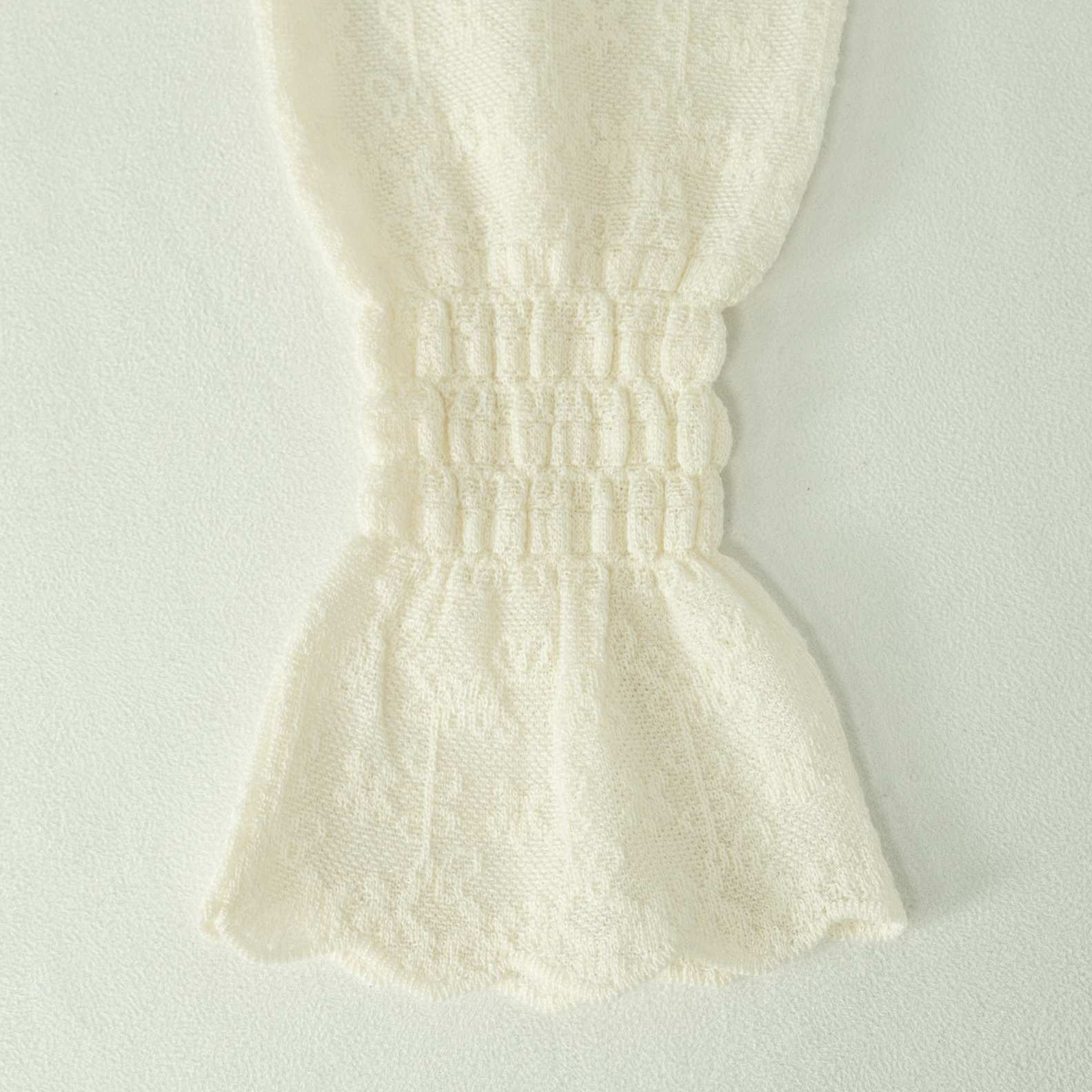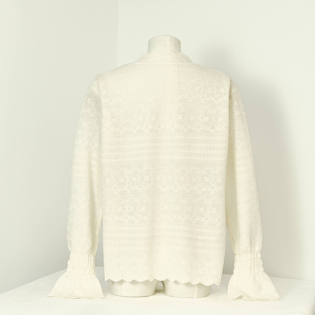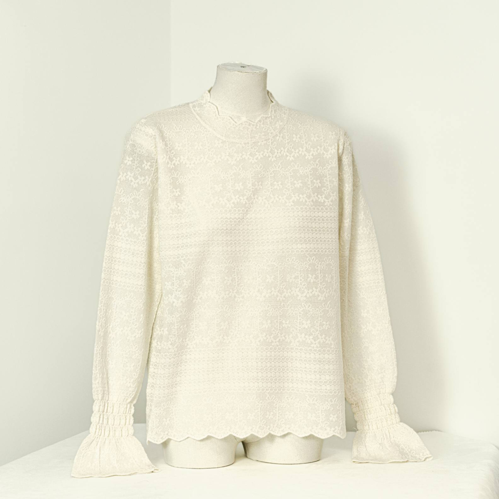 An elegant wool knit top in ivory, featuring a delicate all-over floral lace texture. Detailed with a scalloped mock neck, smocked cuffs, and a scalloped hem for a refined feminine look.