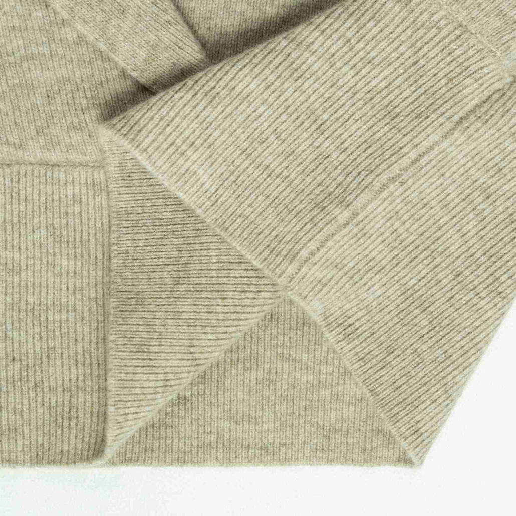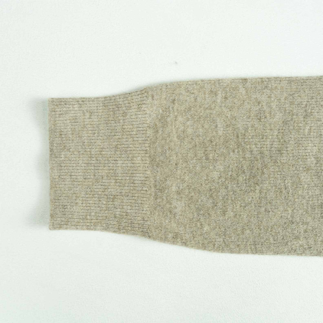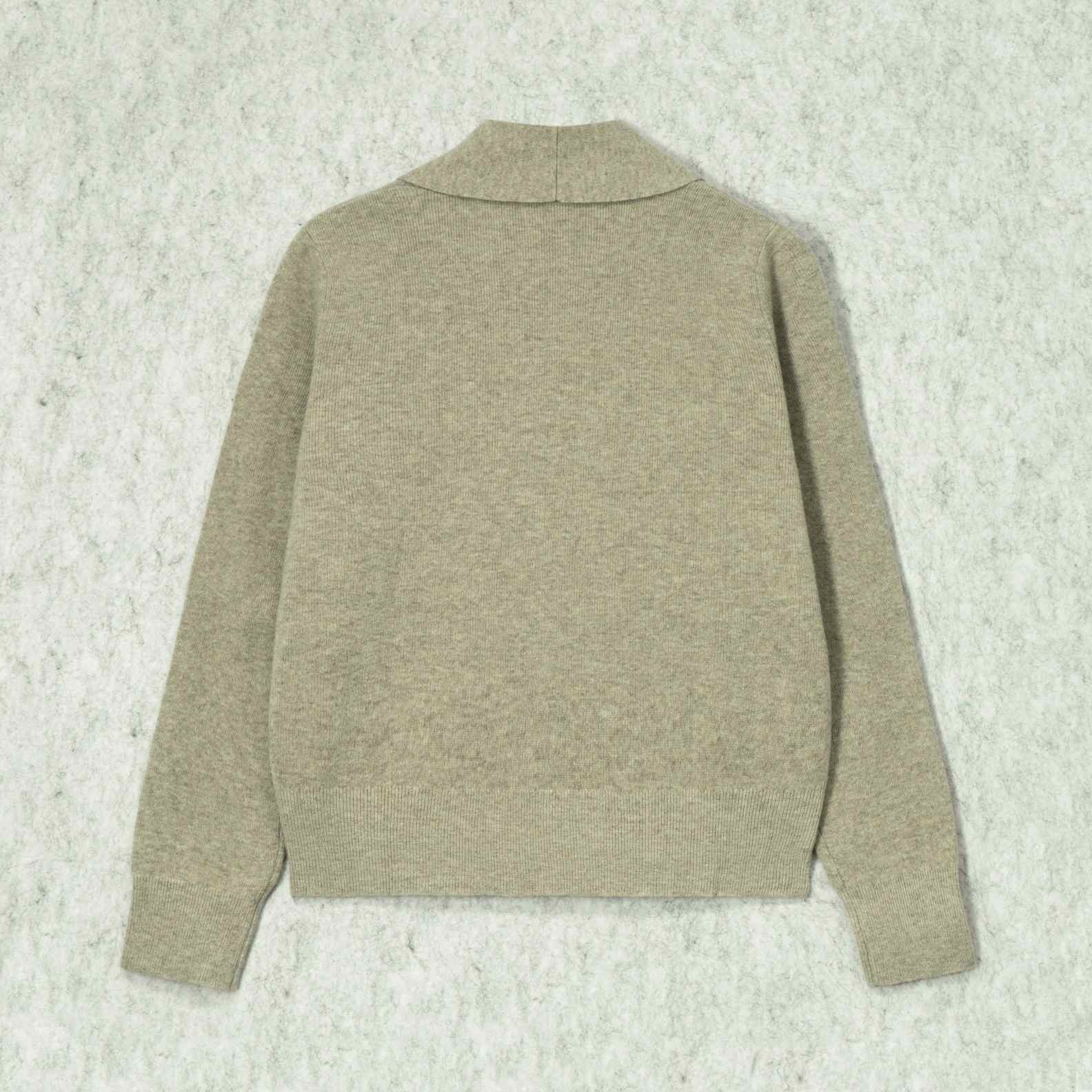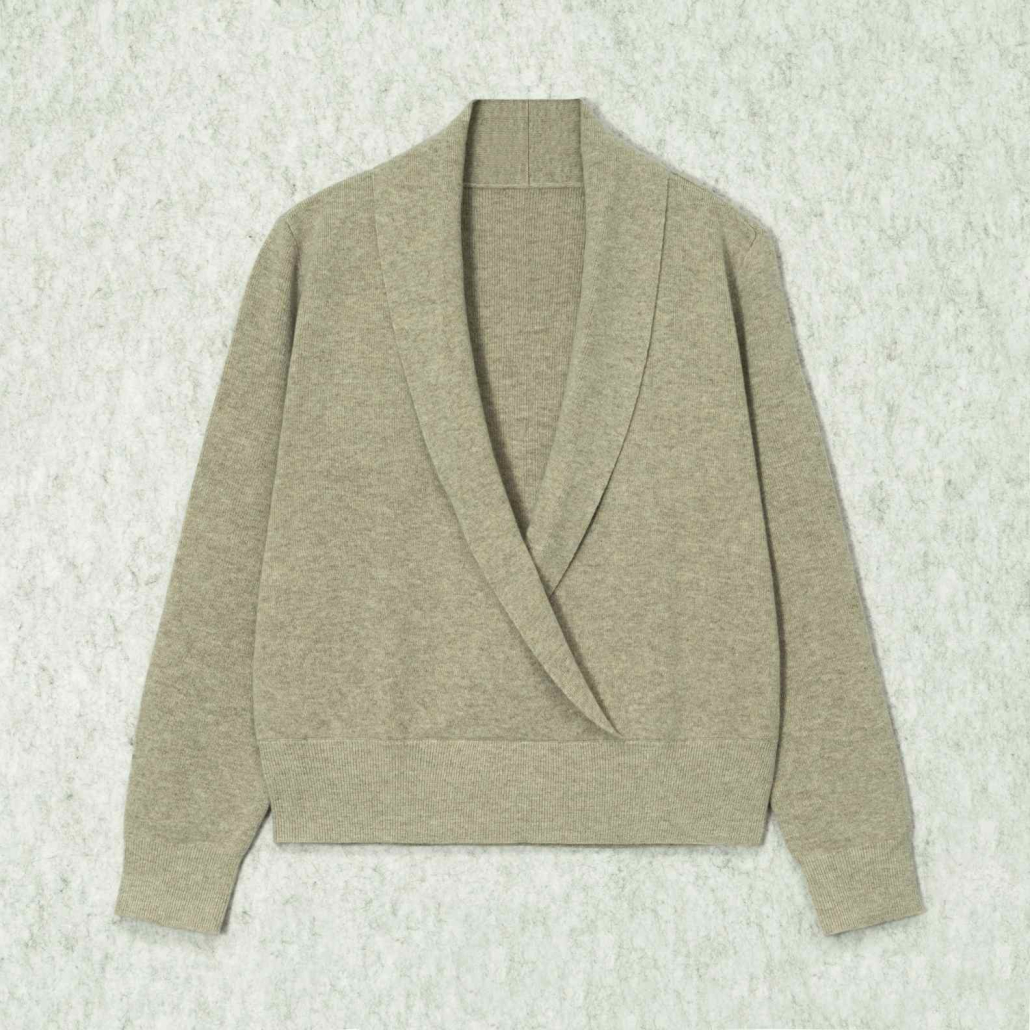 An elegant wool knit sweater in neutral light beige. Featuring a sophisticated shawl collar and a wrap-front silhouette with deep ribbed trims for a refined, cozy aesthetic.