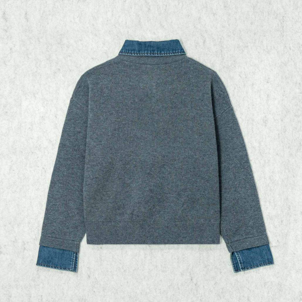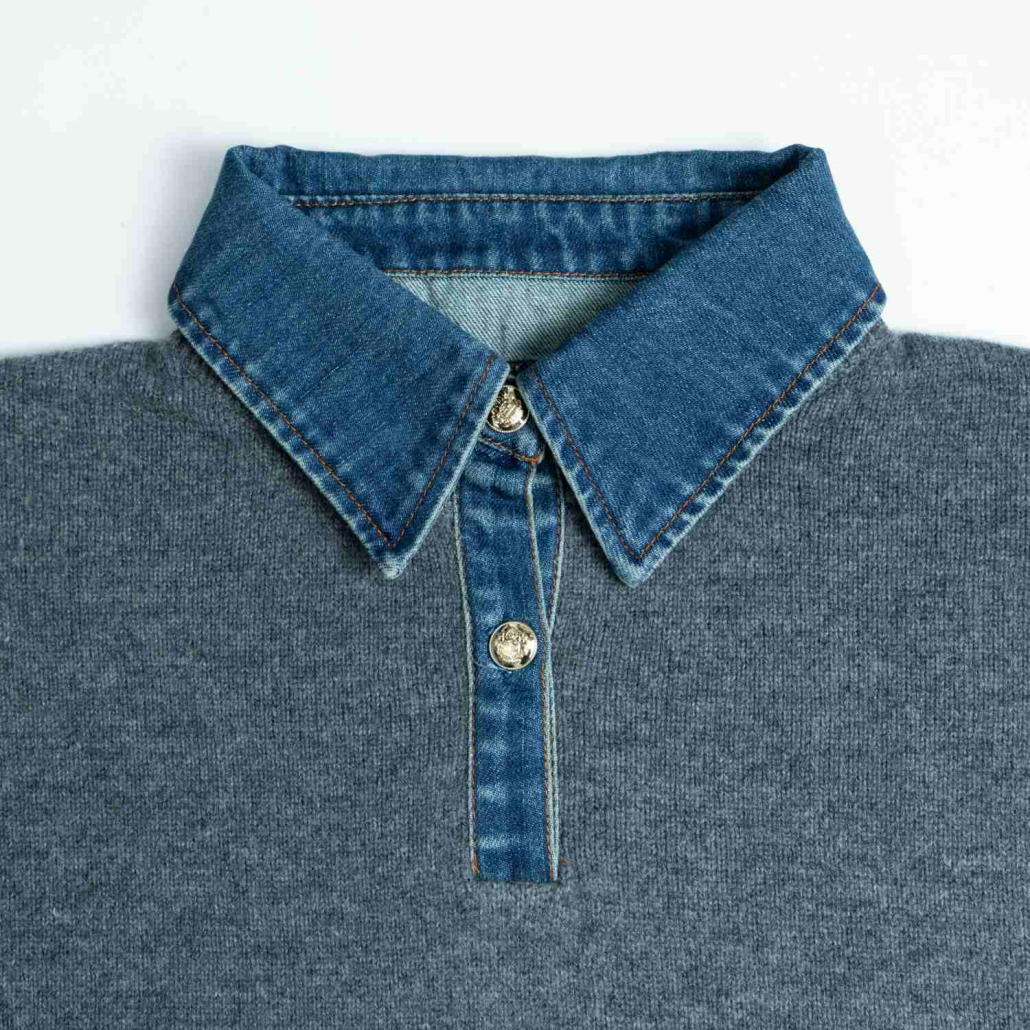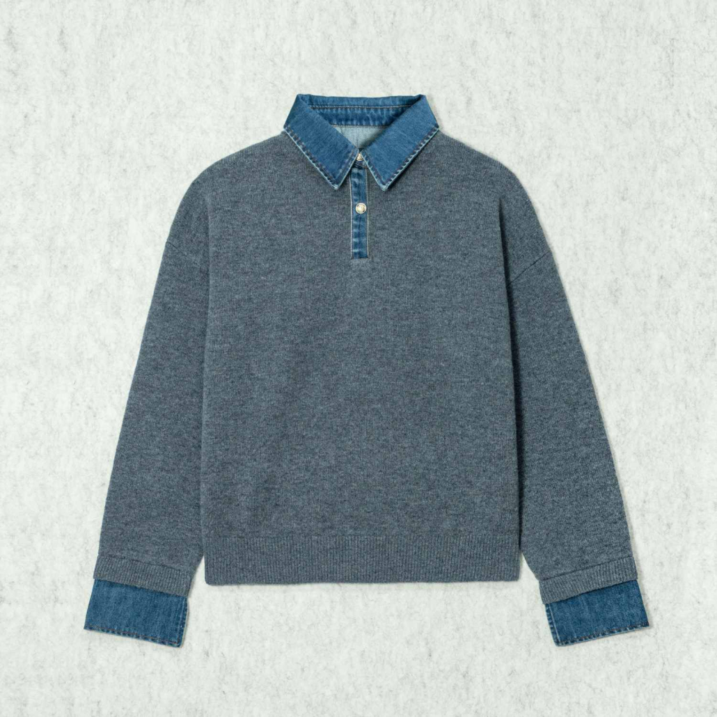 A sophisticated wool knit top featuring a unique denim-textured collar and cuffs. This long-sleeve polo sweater offers a modern, layered look in a versatile grey hue.