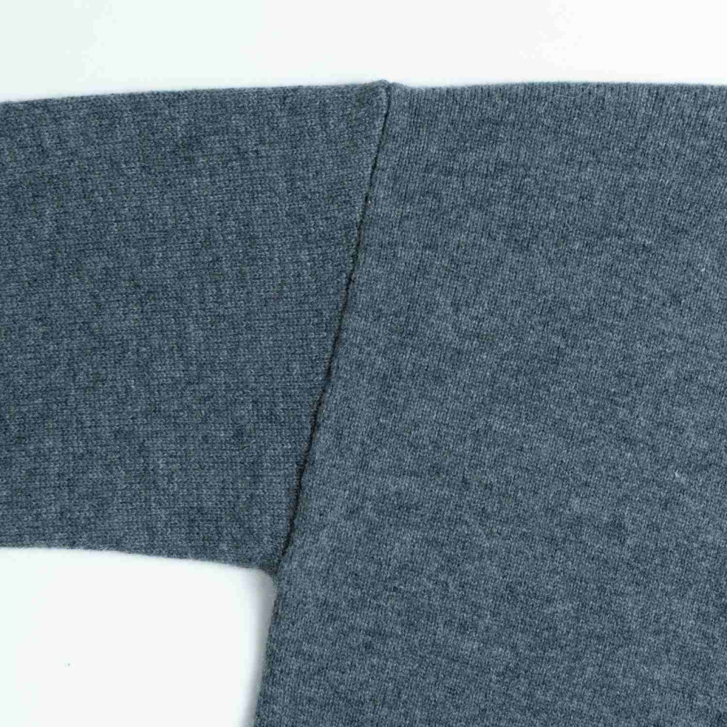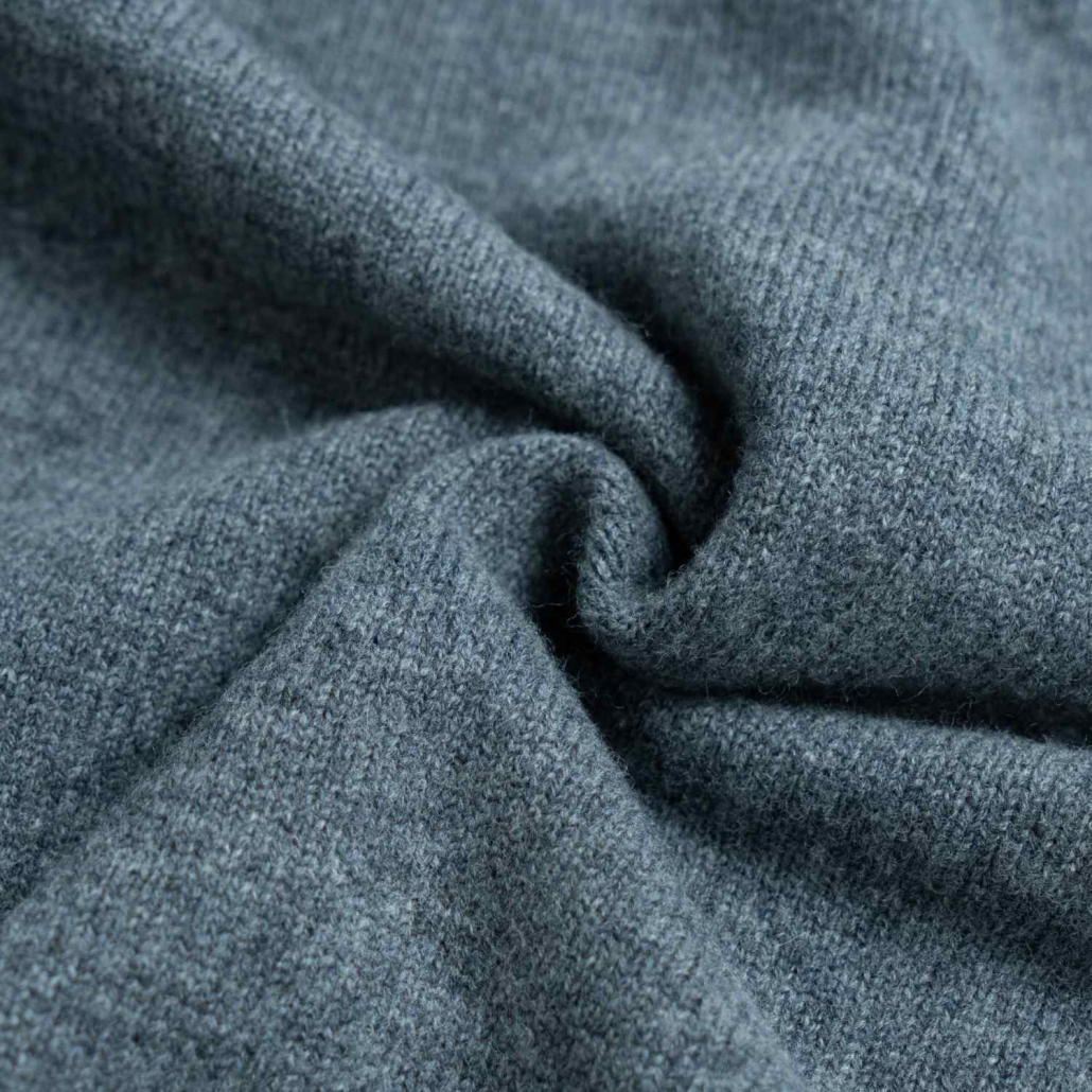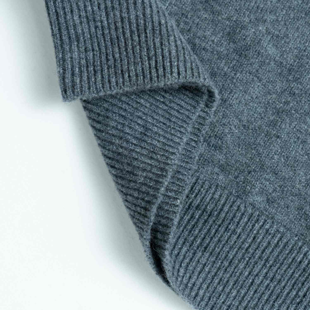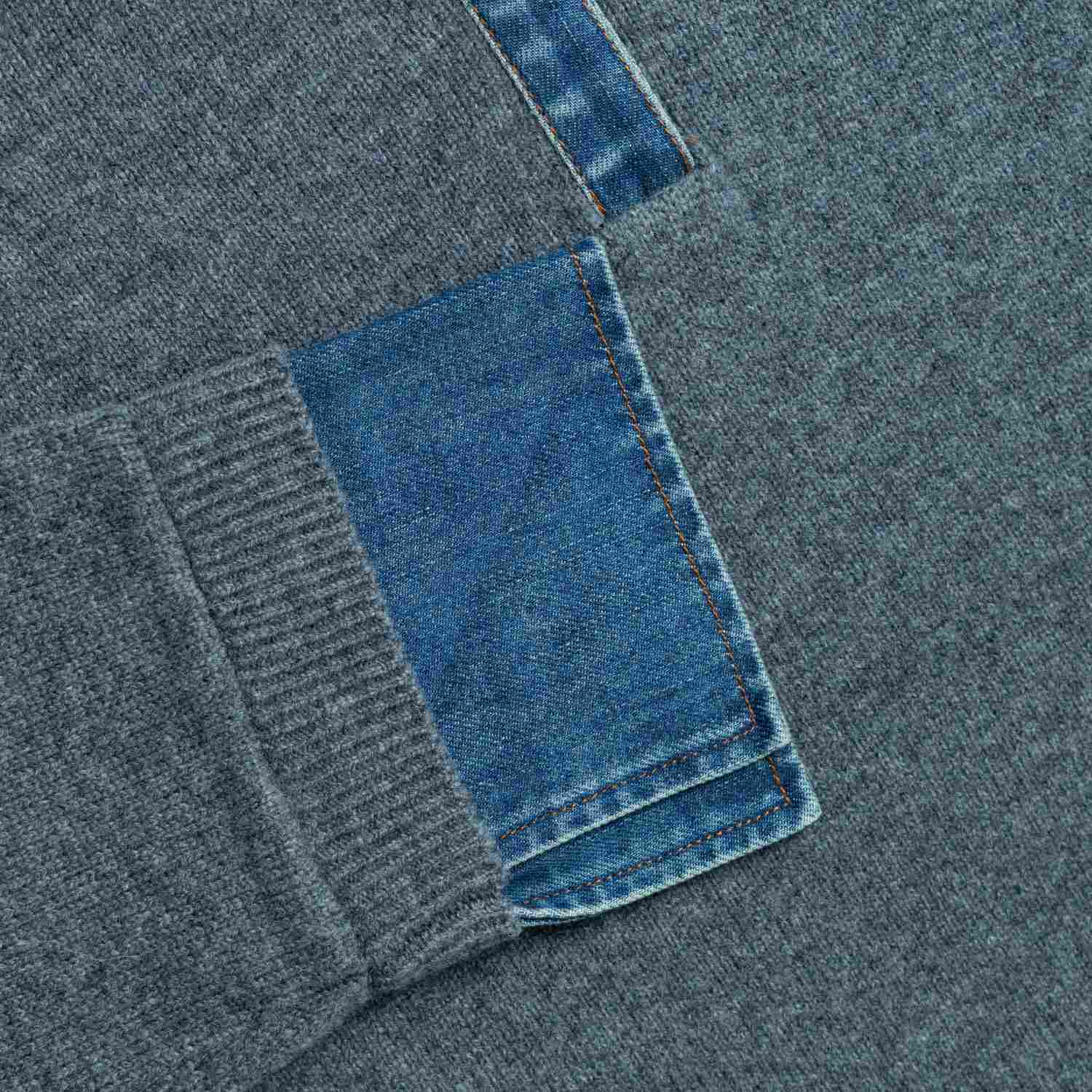 A sophisticated wool knit top featuring a unique denim-textured collar and cuffs. This long-sleeve polo sweater offers a modern, layered look in a versatile grey hue.