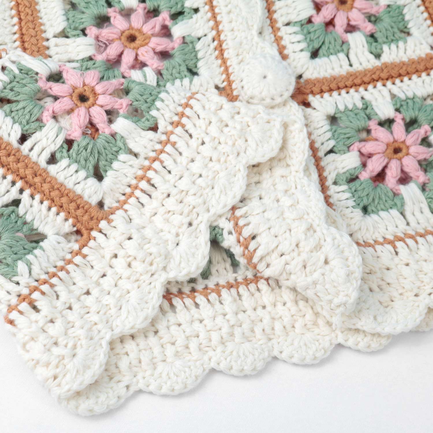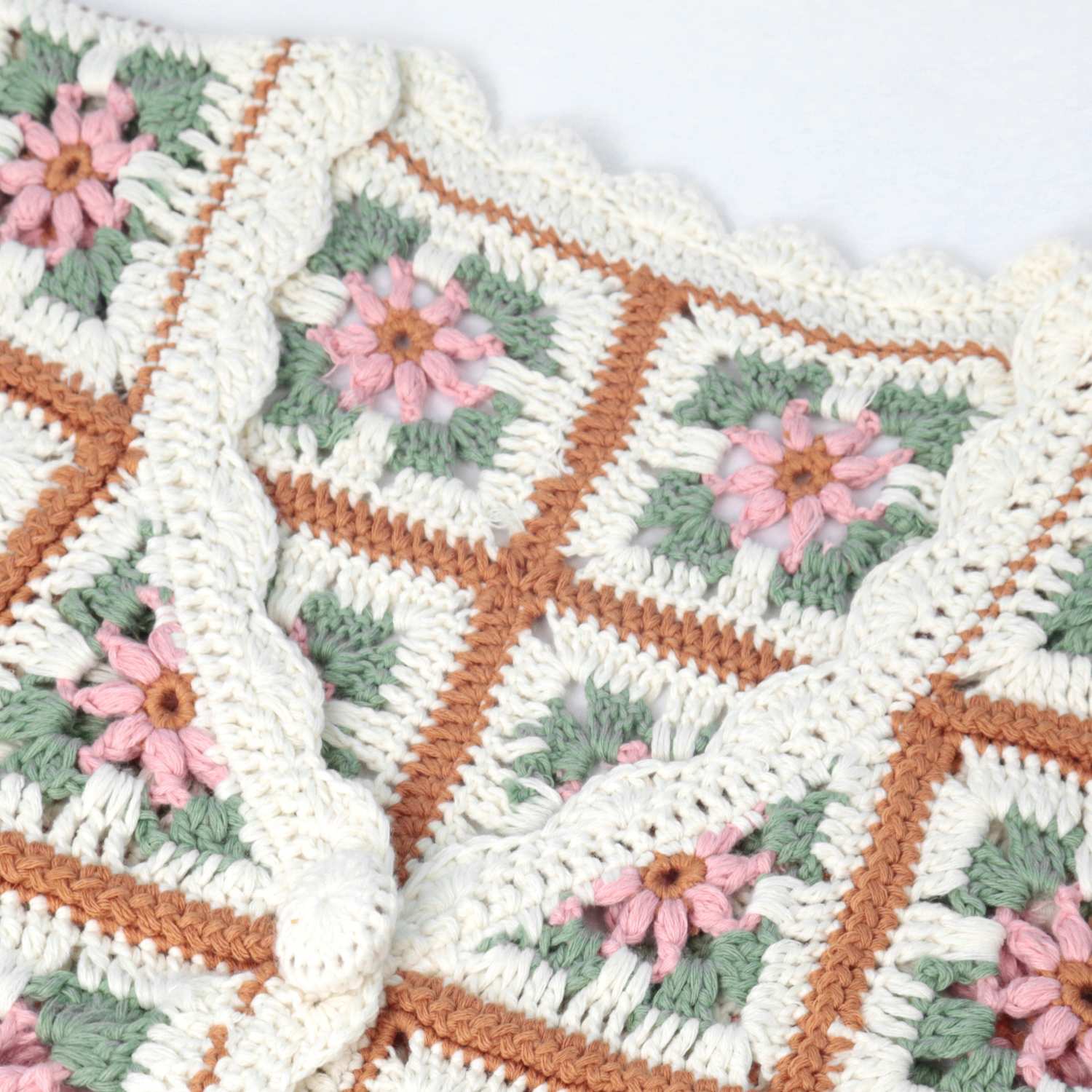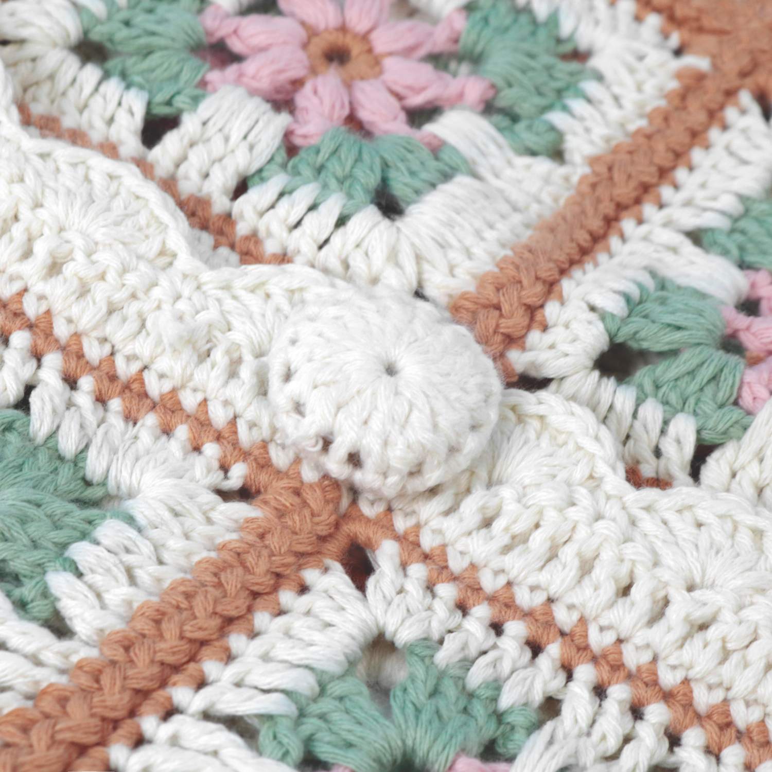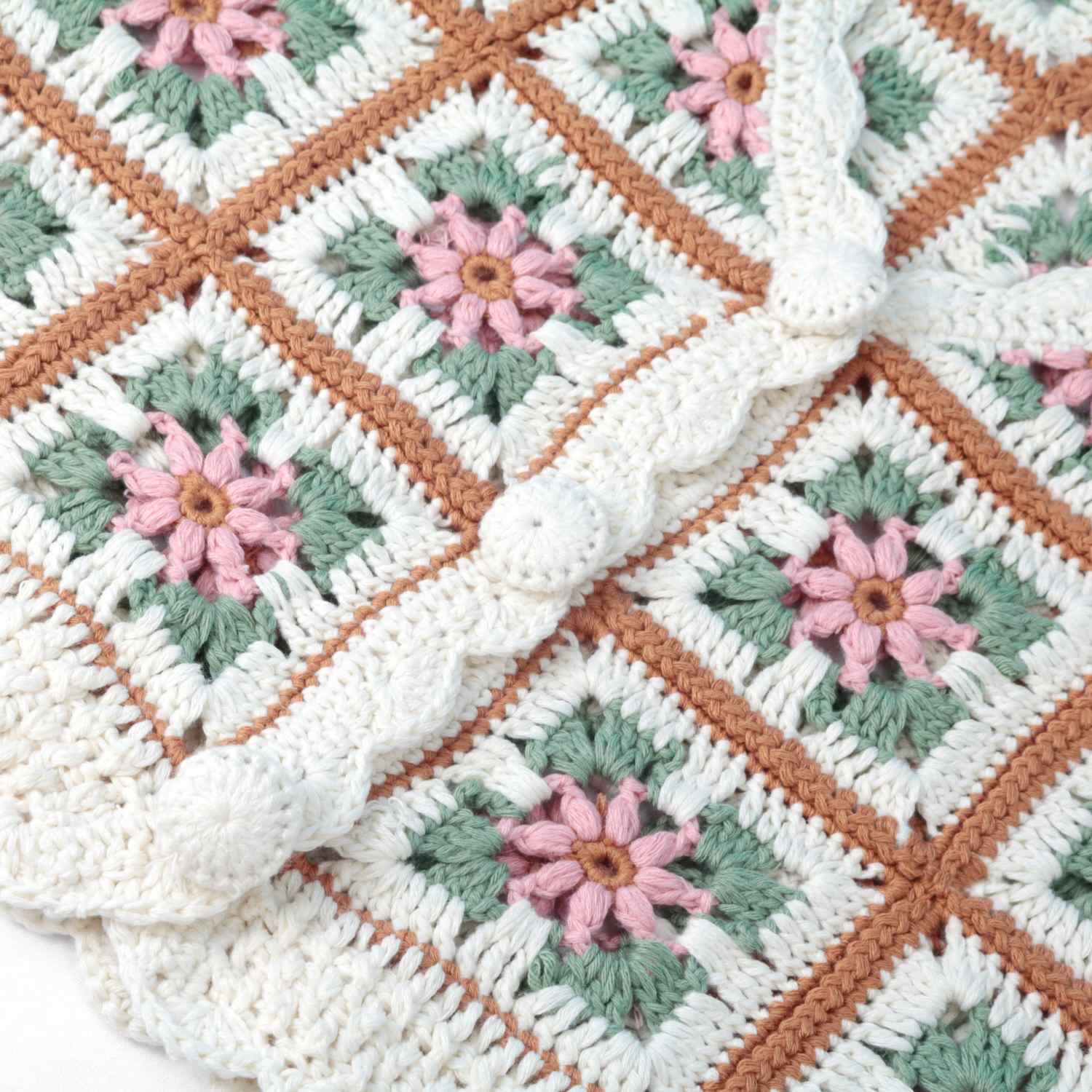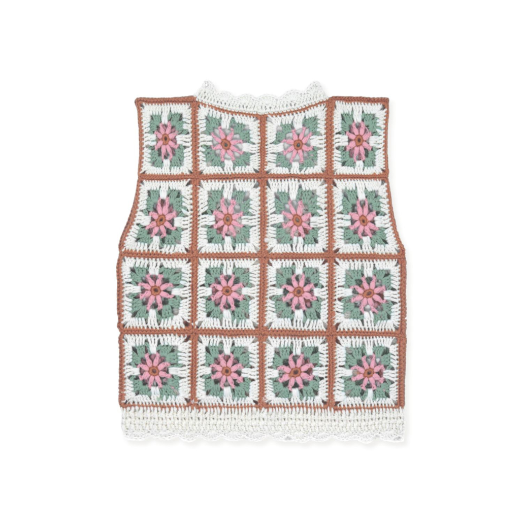 Add a vintage touch with this wool knit vest featuring a colorful floral crochet pattern. Designed with a classic V-neck, button-down front, and delicate scalloped trim.