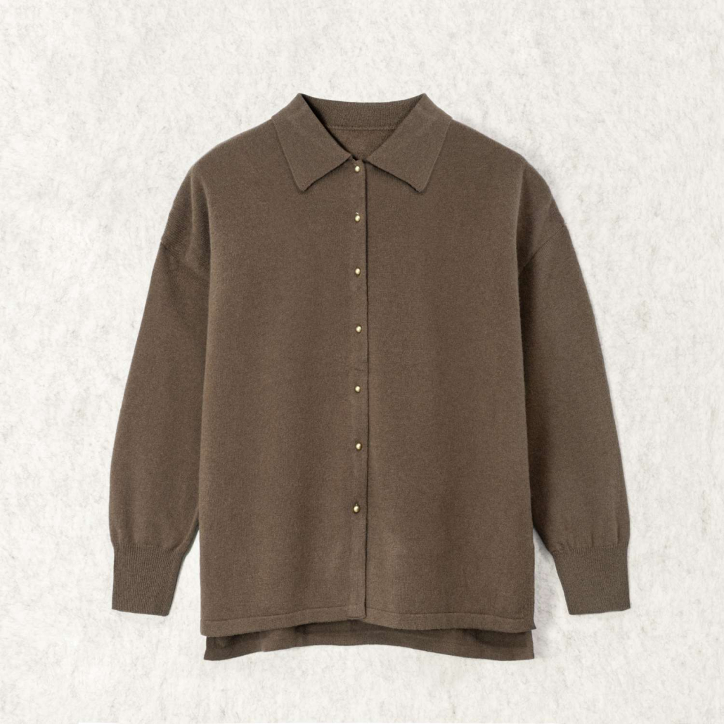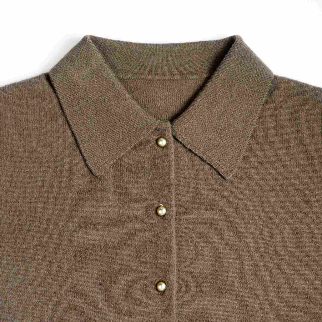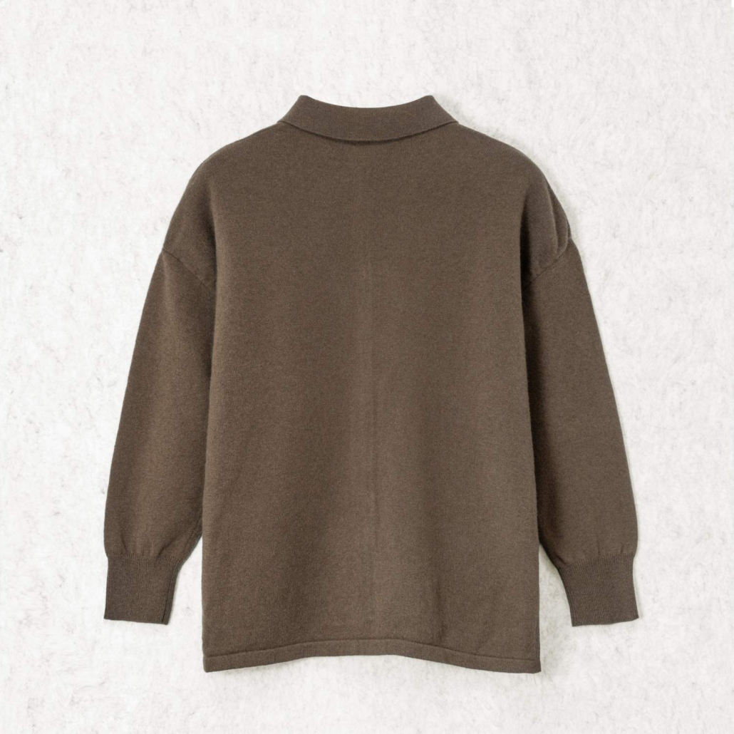 A versatile wool knit polo sweater in deep brown. Features a classic polo collar, button-front closure, and a modern high-low hem with side slits.