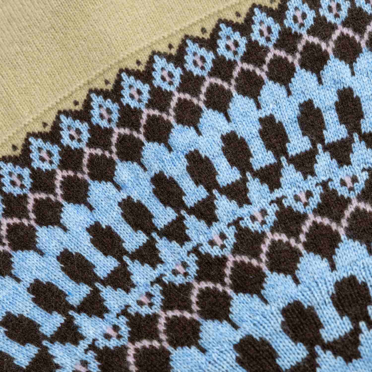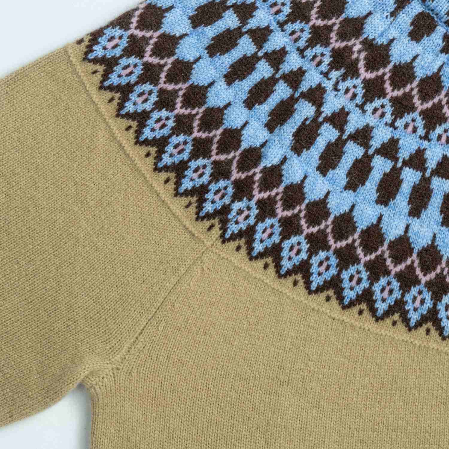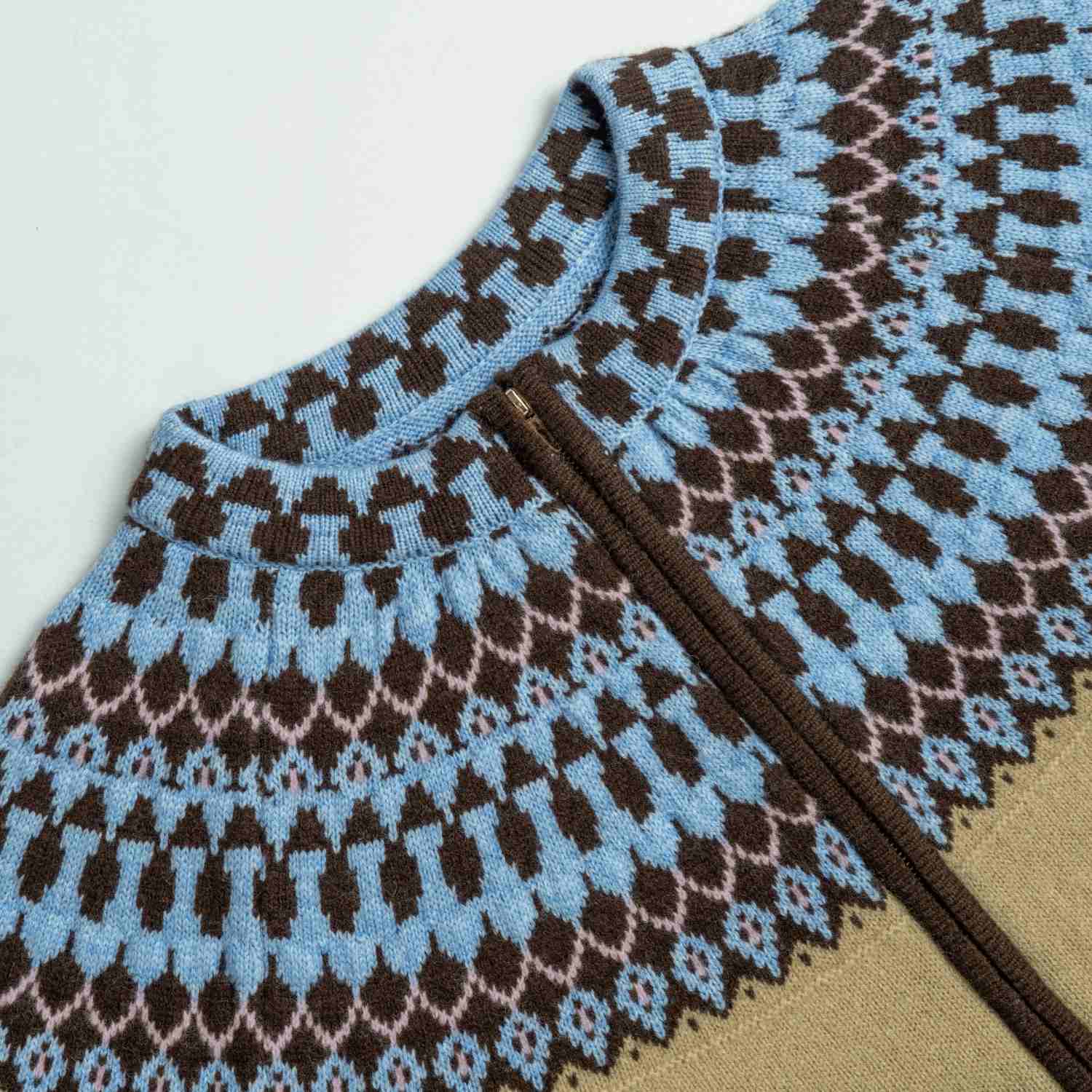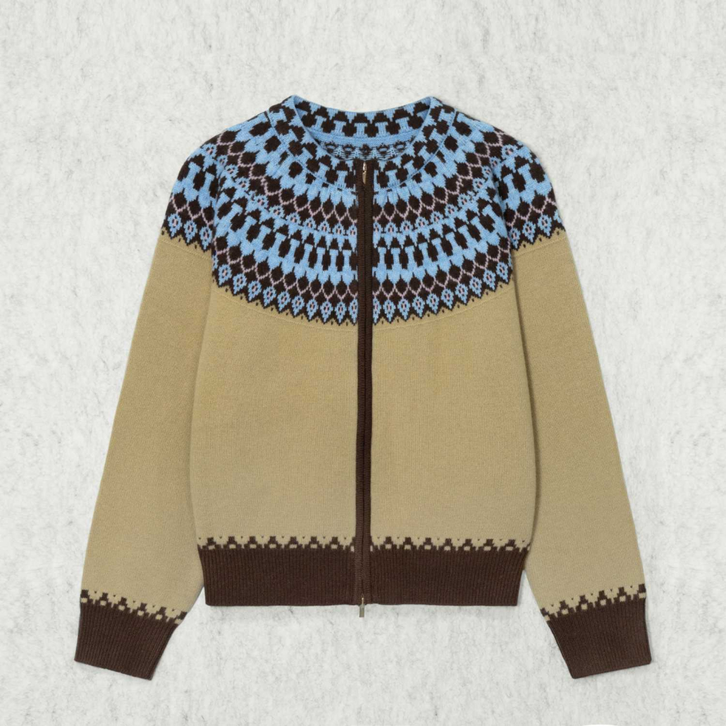 A cozy wool knit zip-up sweater in beige. Features a striking light blue and brown Fair Isle yoke pattern, a full-zip front, and dark brown ribbed contrast trims.
